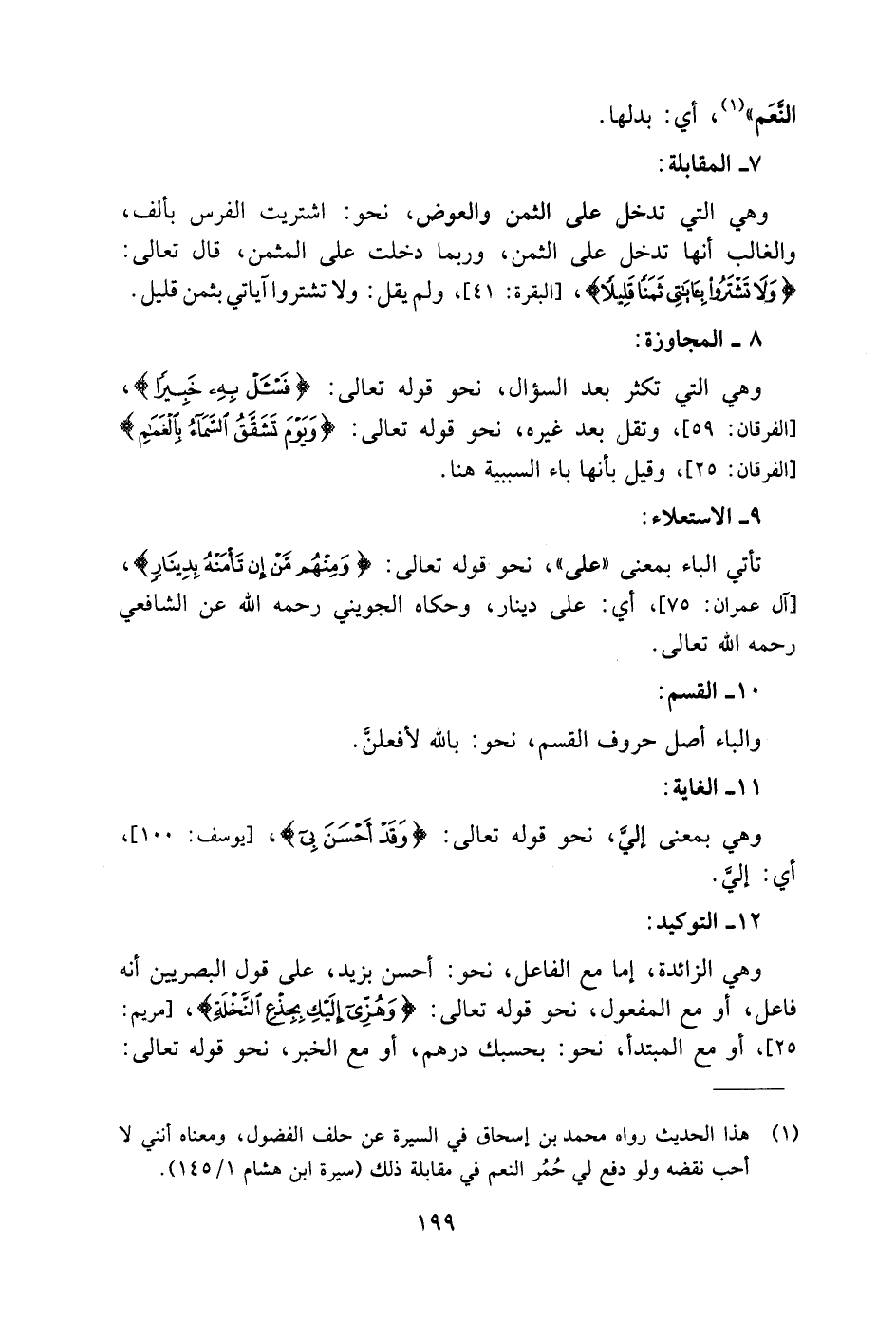 وهي التي تدخل على الثمن والعوض، نحو: اشتريت الفرس بألف، والغالب أنها تدخل على الثمن، وربما دخلت على المثمن، قال تعالى: {وَلَا تَشْتَرُوا بِآيَاتِي ثَمَنًا قَلِيلًا} [البقرة: ٤١]، ولم يقل؛ ولا تشتروا آياتي بثمن قليل.