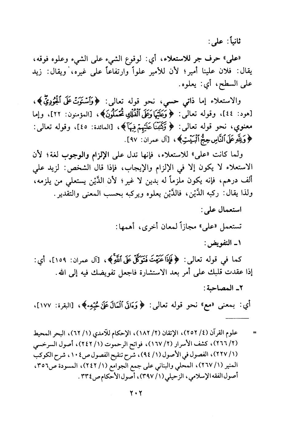 والاستعلاء إما ذاتي حسي، نحو قوله تعالى: {وَاسْتَوَتْ عَلَى الْجُودِيِّ}، [هود: ٤٤]، وقوله تعالى: {وَعَلَيْهَا وَعَلَى الْفُلْكِ تُحْمَلُونَ (٢٢)} [المؤمنون: ٢٢]، وإما معنوي، نحو قوله تعالى: {وَكَتَبْنَا عَلَيْهِمْ فِيهَا}، [المائدة: ٤٥]، وقوله تعالى: {وَلِلَّهِ عَلَى النَّاسِ حِجُّ الْبَيْتِ}، [آل عمران: ٩٧].