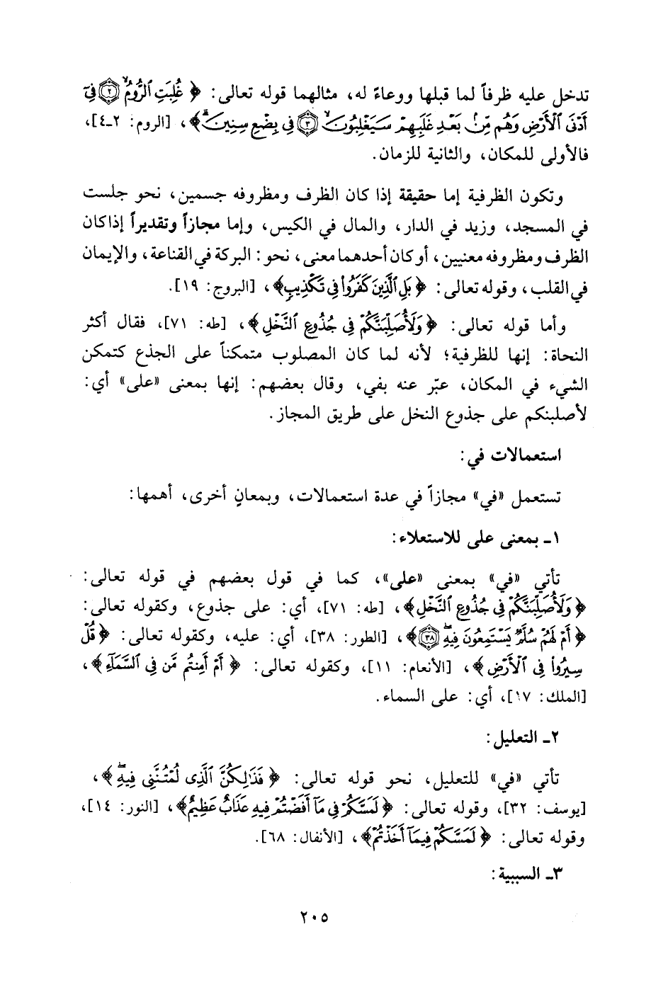 وأما قوله تعالى: {وَلأُصَلِّبَنَّكُمْ فِي جُذُوعِ النَّخْلِ}، [طه: ٧١]، فقال أكثر النحاة: إنها للظرفية؛ لأنه لما كان المصلوب متمكنًا على الجذع كتمكن الشيء في المكان، عبّر عنه بفي، وقال بعضهم: إنها بمعنى "على" أي: لأصلبنكم على جذاع النخل على طريق المجاز.