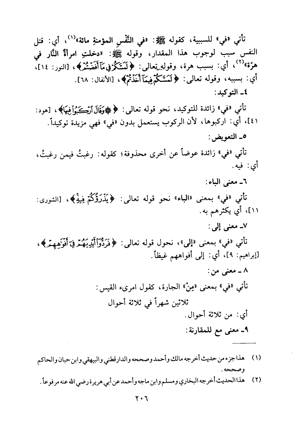 تأتي "في" للسببية، كقوله - صلى الله عليه وسلم -: "في النَّفْسِ المؤمنةِ مائة" (١)، أي: قتل النفس سبب لوجوب هذا المقدار، وقوله - صلى الله عليه وسلم -: "دخلتِ امرأةٌ النَّار في هرّة" (٢)، أي: بسبب هرة، وقوله تعالى: {لَمَسَّكُمْ فِي مَا أَفَضْتُمْ}، [النور: ١٤]، أي: بسببه، وقوله تعالى: {لَمَسَّكُمْ فِيمَا أَخَذْتُمْ}، [الأنفال: ٦٨].
