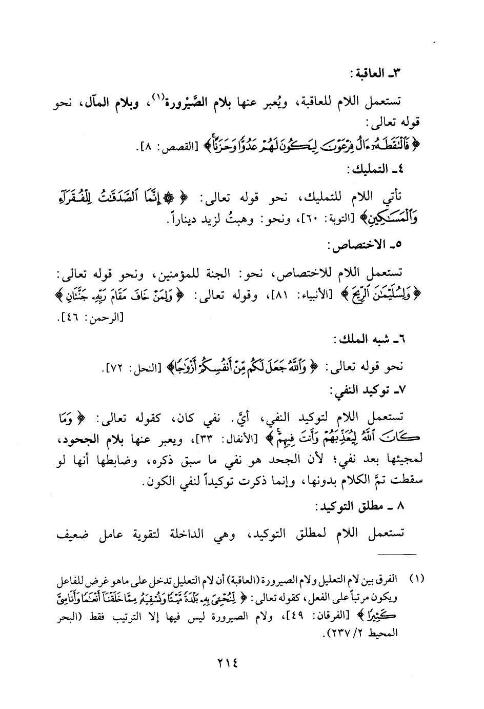 (١) الفرق بين لام التعليل ولام الصيرورة (العاقبة) أن لام التعليل تدخل على ما هو غرض للفاعل ويكون مرتبًا على الفعل، كقوله تعالى: {لِنُحْيِيَ بِهِ بَلْدَةً مَيْتًا وَنُسْقِيَهُ مِمَّا خَلَقْنَا أَنْعَامًا وَأَنَاسِيَّ كَثِيرًا (٤٩)} [الفرقان: ٤٩]، ولام الصيرورة ليس فيها إلا الترتيب فقط (البحر المحيط ٢/ ٢٣٧).