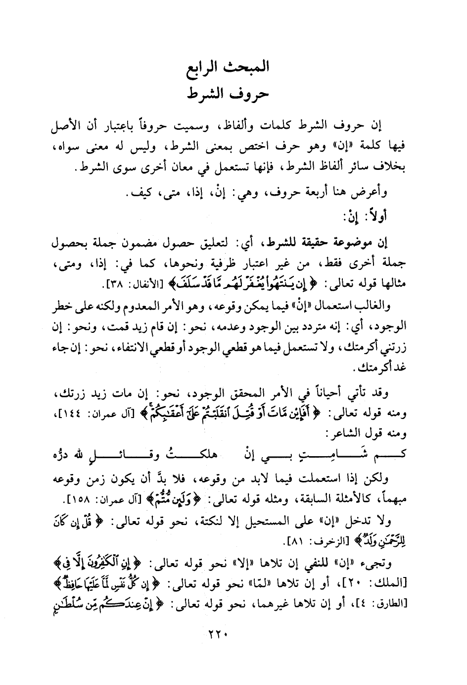 إن موضوعة حقيقة للشرط، أي: لتعليق حصول مضمون جملة بحصول جملة أخرى فقط، من غير اعتبار ظرفية ونحوها، كما في: إذا، ومتى، مثالها قوله تعالى: {إِنْ يَنْتَهُوا يُغْفَرْ لَهُمْ مَا قَدْ سَلَفَ} [الأنفال: ٣٨].
