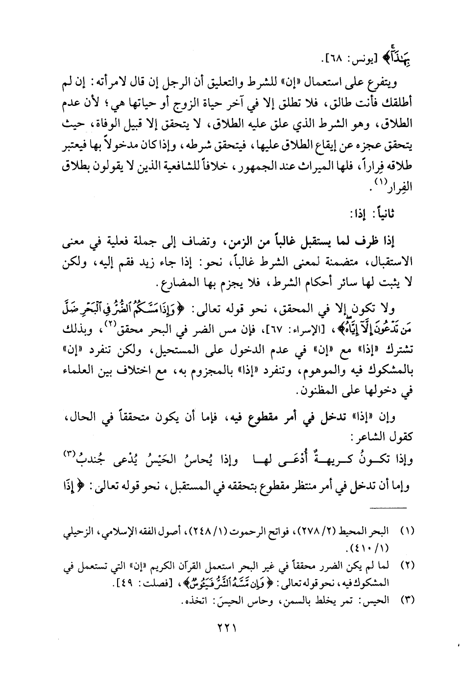ولا تكون إلا في المحقق، نحو قوله تعالى: {وَإِذَا مَسَّكُمُ الضُّرُّ فِي الْبَحْرِ ضَلَّ مَنْ تَدْعُونَ إلا إِيَّاهُ}، [الإسراء: ٦٧]، فإن مس الضر في البحر محقق (٢)، وبذلك تشترك "إذا" مع "إن" في عدم الدخول على المستحيل، ولكن تنفرد "إن" بالمشكوك فيه والموهوم، وتنفرد "إذا" بالمجزوم به، مع اختلاف بين العلماء في دخولها على المظنون.