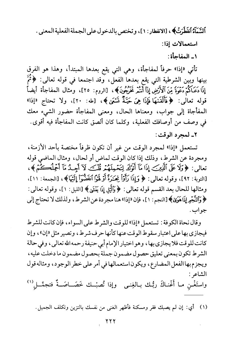 تأتي "إذا" حرفًا لمفاجأة، وهي التي يقع بعدها المبتدأ، وهذا هو الفرق بينها وبين الشرطية التي يقع بعدها الفعل، وقد اجتمعا في قوله تعالى: {ثُمَّ إِذَا دَعَاكُمْ دَعْوَةً مِنَ الْأَرْضِ إِذَا أَنْتُمْ تَخْرُجُونَ}، [الروم: ٢٥]، ومثال المفاجأة أيضًا قوله تعالى: {فَأَلْقَاهَا فَإِذَا هِيَ حَيَّةٌ تَسْعَى (٢٠)} [طه: ٢٠]، ولا تحتاج "إذا" المفاجأة إلى جواب، ومعناها الحال، ومعنى المفاجأة حضور الشيء معك في وصف من أوصافك الفعلية، وكلما كان ألصق كانت المفاجأة فيه أقوى.