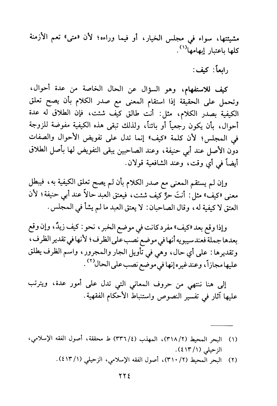كيف للاستفهام، وهو السؤال عن الحال الخاصة من عدة أحوال، وتحمل على الحقيقة إذا استقام المعنى مع صدر الكلام بأن يصح تعلق الكيفية بصدر الكلام، مثل: أنت طالق كيف شئت، فإن الطلاق له عدة أحوال، بأن يكون رجعيًّا أو بائنًا، ولذلك تبقى هذه الكيفية مفوضة للزوجة في المجلس؛ لأن كلمة "كيف" إنما تدل على تفويض الأحوال والصفات دون الأصل عند أبي حنيفة، وعند الصاحبين يبقى التفويض لها بأصل الطلاق أيضًا في أي وقت، وعند الشافعية قولان.