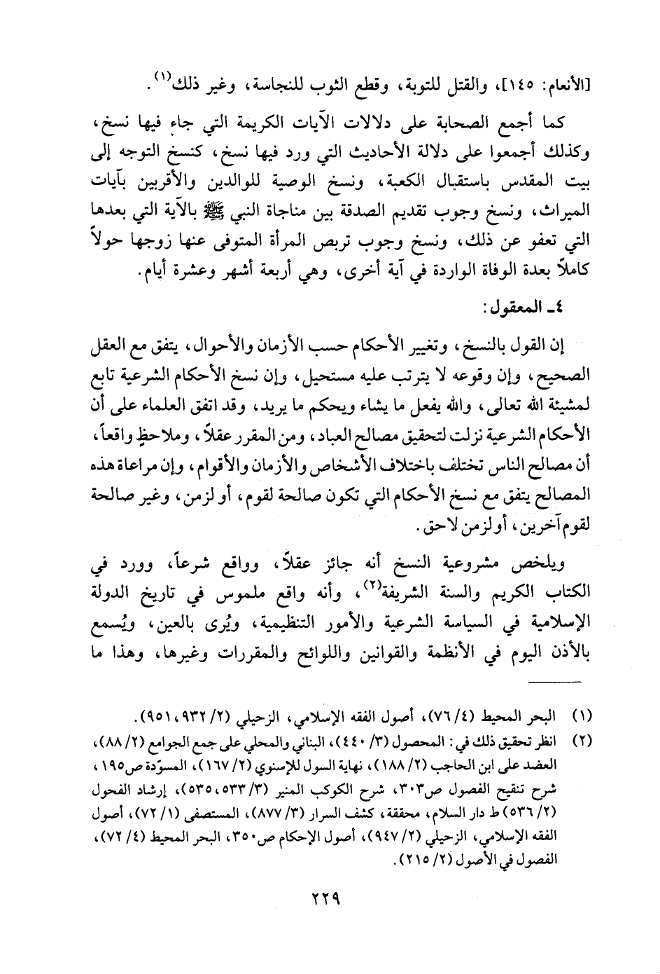 ويلخص مشروعية النسخ أنه جائز عقلًا، وواقع شرعًا، وورد في الكتاب الكريم والسنة الشريفة (٢)، وأنه واقع ملموس في تاريخ الدولة الإسلامية في السياسة الشرعية والأمور التنظيمية، ويُرى بالعين، ويُسمع بالأذن اليوم في الأنظمة والقوانين واللوائح والمقررات وغيرها، وهذا ما