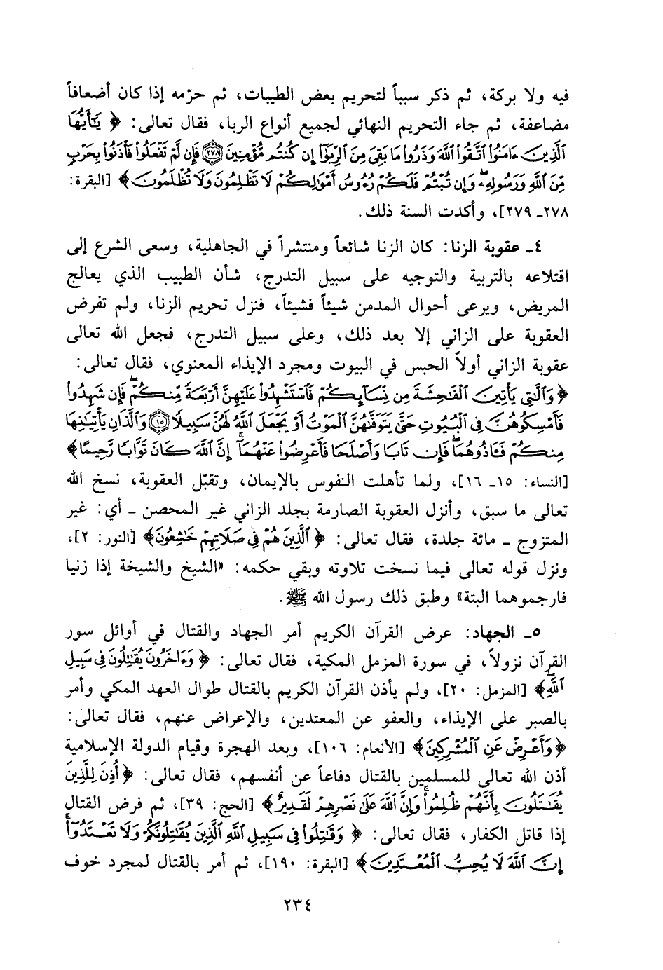 ٥ - الجهاد: عرض القرآن الكريم أمر الجهاد والقتال في أوائل سور القرآن نزولًا، في سورة المزمل المكية، فقال تعالى: {وَآخَرُونَ يُقَاتِلُونَ فِي سَبِيلِ اللَّهِ} [المزمل: ٢٠]، ولم يأذن القرآن الكريم بالقتال طوال العهد المكي وأمر بالصبر على الإيذاء، والعفو عن المعتدين، والإعراض عنهم، فقال تعالى: {وَأَعْرِضْ عَنِ الْمُشْرِكِينَ} [الأنعام: ١٠٦]، وبعد الهجرة وقيام الدولة الإسلامية أذن اللَّه تعالى للمسلمين بالقتال دفاعًا عن أنفسهم، فقال تعالى: {أُذِنَ لِلَّذِينَ يُقَاتَلُونَ بِأَنَّهُمْ ظُلِمُوا وَإِنَّ اللَّهَ عَلَى نَصْرِهِمْ لَقَدِيرٌ (٣٩)} [الحج: ٣٩]، ثم فرض القتال إذا قاتل الكفار، فقال تعالى: {وَقَاتِلُوا فِي سَبِيلِ اللَّهِ الَّذِينَ يُقَاتِلُونَكُمْ وَلَا تَعْتَدُوا إِنَّ اللَّهَ لَا يُحِبُّ الْمُعْتَدِينَ (١٩٠)} [البقرة: ١٩٠]، ثم أمر بالقتال لمجرد خوف