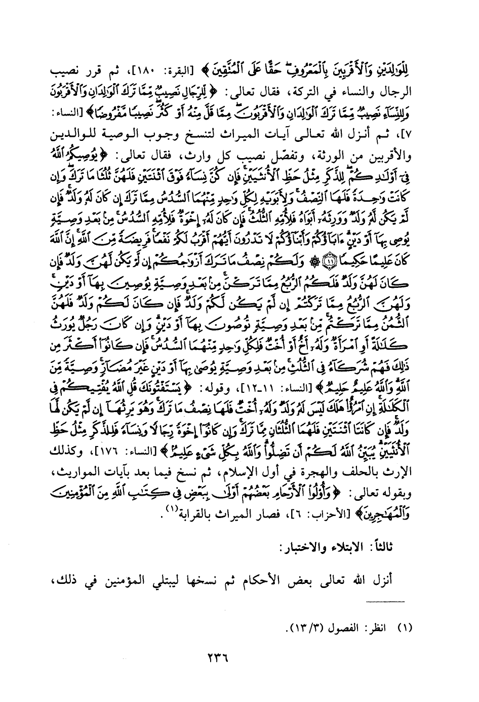 لِلْوَالِدَيْنِ وَالْأَقْرَبِينَ بِالْمَعْرُوفِ حَقًّا عَلَى الْمُتَّقِينَ} [البقرة: ١٨٠]، ثم قرر نصيب الرجال والنساء في التركة، فقال تعالى: {لِلرِّجَالِ نَصِيبٌ مِمَّا تَرَكَ الْوَالِدَانِ وَالْأَقْرَبُونَ وَلِلنِّسَاءِ نَصِيبٌ مِمَّا تَرَكَ الْوَالِدَانِ وَالْأَقْرَبُونَ مِمَّا قَلَّ مِنْهُ أَوْ كَثُرَ نَصِيبًا مَفْرُوضًا (٧)} [النساء: ٧]، ثم أنزل اللَّه تعالى آيات الميراث لتنسخ وجوب الوصية للوالدين والأقربين من الورثة، وتفضل نصيب كل وارث، فقال تعالى: {يُوصِيكُمُ اللَّهُ فِي أَوْلَادِكُمْ لِلذَّكَرِ مِثْلُ حَظِّ الْأُنْثَيَيْنِ فَإِنْ كُنَّ نِسَاءً فَوْقَ اثْنَتَيْنِ فَلَهُنَّ ثُلُثَا مَا تَرَكَ وَإِنْ كَانَتْ وَاحِدَةً فَلَهَا النِّصْفُ وَلِأَبَوَيْهِ لِكُلِّ وَاحِدٍ مِنْهُمَا السُّدُسُ مِمَّا تَرَكَ إِنْ كَانَ لَهُ وَلَدٌ فَإِنْ لَمْ يَكُنْ لَهُ وَلَدٌ وَوَرِثَهُ أَبَوَاهُ فَلِأُمِّهِ الثُّلُثُ فَإِنْ كَانَ لَهُ إِخْوَةٌ فَلِأُمِّهِ السُّدُسُ مِنْ بَعْدِ وَصِيَّةٍ يُوصِي بِهَا أَوْ دَيْنٍ آبَاؤُكُمْ وَأَبْنَاؤُكُمْ لَا تَدْرُونَ أَيُّهُمْ أَقْرَبُ لَكُمْ نَفْعًا فَرِيضَةً مِنَ اللَّهِ إِنَّ اللَّهَ كَانَ عَلِيمًا حَكِيمًا (١١) وَلَكُمْ نِصْفُ مَا تَرَكَ أَزْوَاجُكُمْ إِنْ لَمْ يَكُنْ لَهُنَّ وَلَدٌ فَإِنْ كَانَ لَهُنَّ وَلَدٌ فَلَكُمُ الرُّبُعُ مِمَّا تَرَكْنَ مِنْ بَعْدِ وَصِيَّةٍ يُوصِينَ بِهَا أَوْ دَيْنٍ وَلَهُنَّ الرُّبُعُ مِمَّا تَرَكْتُمْ إِنْ لَمْ يَكُنْ لَكُمْ وَلَدٌ فَإِنْ كَانَ لَكُمْ وَلَدٌ فَلَهُنَّ الثُّمُنُ مِمَّا تَرَكْتُمْ مِنْ بَعْدِ وَصِيَّةٍ تُوصُونَ بِهَا أَوْ دَيْنٍ وَإِنْ كَانَ رَجُلٌ يُورَثُ كَلَالَةً أَوِ امْرَأَةٌ وَلَهُ أَخٌ أَوْ أُخْتٌ فَلِكُلِّ وَاحِدٍ مِنْهُمَا السُّدُسُ فَإِنْ كَانُوا أَكْثَرَ مِنْ ذَلِكَ فَهُمْ شُرَكَاءُ فِي الثُّلُثِ مِنْ بَعْدِ وَصِيَّةٍ يُوصَى بِهَا أَوْ دَيْنٍ غَيْرَ مُضَارٍّ وَصِيَّةً مِنَ اللَّهِ وَاللَّهُ عَلِيمٌ حَلِيمٌ} [النساء: ١١ - ١٢]، وقوله: {يَسْتَفْتُونَكَ قُلِ اللَّهُ يُفْتِيكُمْ فِي الْكَلَالَةِ إِنِ امْرُؤٌ هَلَكَ لَيْسَ لَهُ وَلَدٌ وَلَهُ أُخْتٌ فَلَهَا نِصْفُ مَا تَرَكَ وَهُوَ يَرِثُهَا إِنْ لَمْ يَكُنْ لَهَا وَلَدٌ فَإِنْ كَانَتَا اثْنَتَيْنِ فَلَهُمَا الثُّلُثَانِ مِمَّا تَرَكَ وَإِنْ كَانُوا إِخْوَةً رِجَالًا وَنِسَاءً فَلِلذَّكَرِ مِثْلُ حَظِّ الْأُنْثَيَيْنِ يُبَيِّنُ اللَّهُ لَكُمْ أَنْ تَضِلُّوا وَاللَّهُ بِكُلِّ شَيْءٍ عَلِيمٌ} [النساء: ١٧٦]، وكذلك الإرث بالحلف والهجرة في أول الإسلام، ثم نسخ فيما بعد بآيات المواريث، وبقوله تعالى: {وَأُولُو الْأَرْحَامِ بَعْضُهُمْ أَوْلَى بِبَعْضٍ فِي كِتَابِ اللَّهِ مِنَ الْمُؤْمِنِينَ وَالْمُهَاجِرِينَ} [الأحزاب: ٦]، فصار الميراث بالقرابة (١).