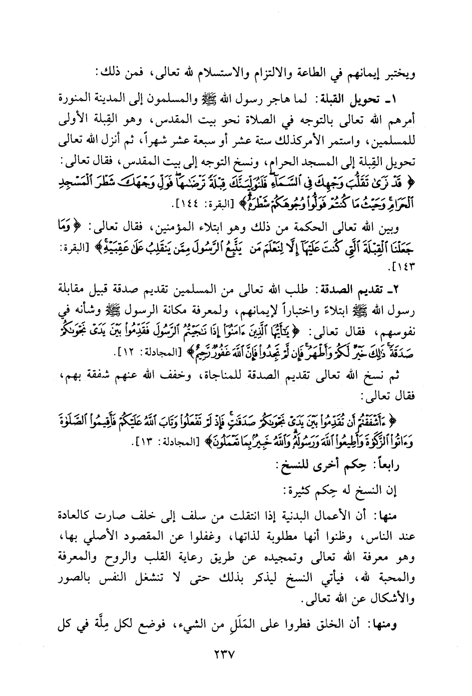 منها: أن الأعمال البدنية إذا انتقلت من سلف إلى خلف صارت كالعادة عند الناس، وظنوا أنها مطلوبة لذاتها، وغفلوا عن المقصود الأصلي بها، وهو معرفة اللَّه تعالى وتمجيده عن طريق رعاية القلب والروح والمعرفة والمحبة للَّه، فيأتي النسخ ليذكر بذلك حتى لا تنشغل النفس بالصور والأشكال عن اللَّه تعالى.
