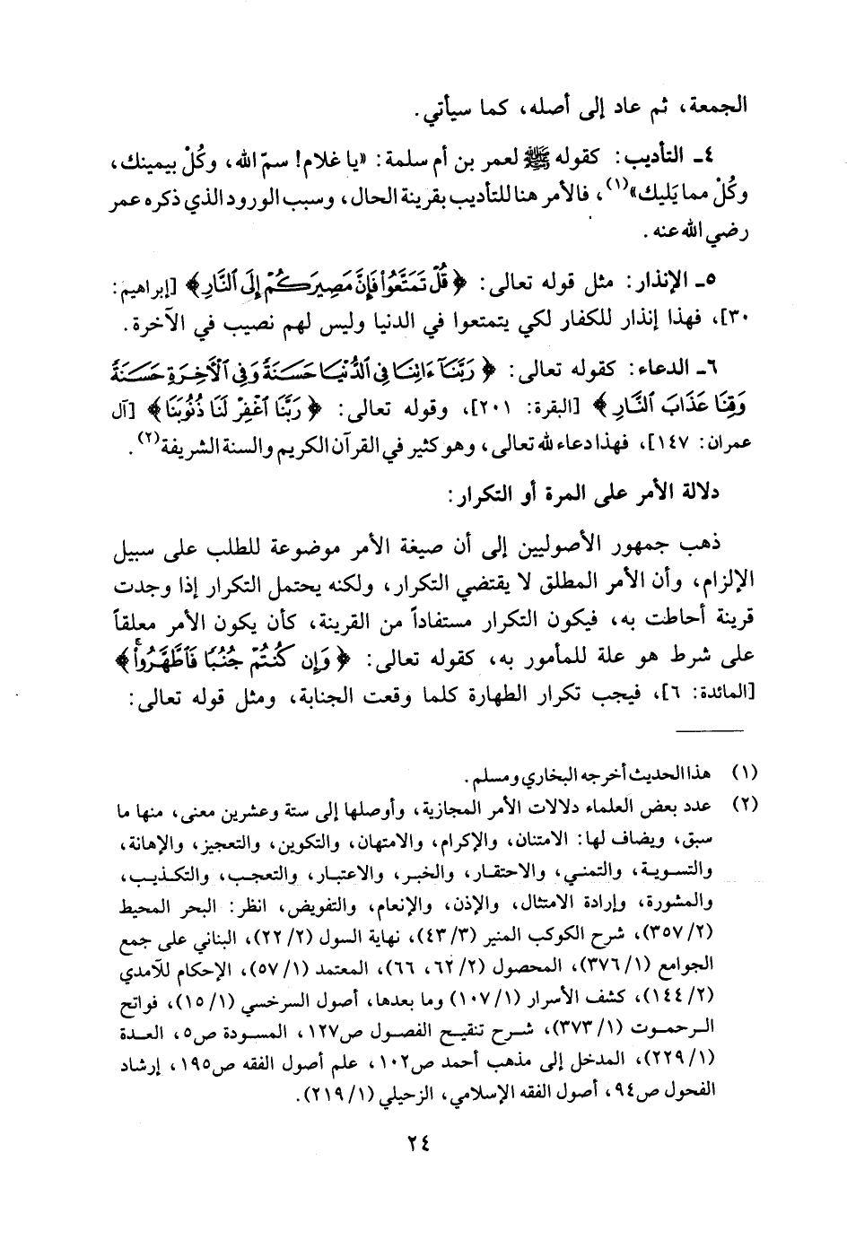 ذهب جمهور الأصوليين إلى أن صيغة الأمر موضوعة للطلب على سبيل الإلزام، وأن الأمر المطلق لا يقتضي التكرار، ولكنه يحتمل التكرار إذا وجدت قرينة أحاطت به، فيكون التكرار مستفادًا من القرينة، كأن يكون الأمر معلقًا على شرط هو علة للمأمور به، كقوله تعالى {وَإِنْ كُنْتُمْ جُنُبًا فَاطَّهَّرُوا} [المائدة: ٦]، فيجب تكرار الطهارة كلما وقعت الجنابة، ومثل قوله تعالى: