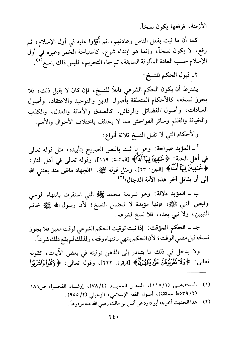 ب- الحكم المؤقت: إذا ثبت توقيت الحكم الشرعي لوقت معين فلا يجوز نسخه قبل مضي الوقت؛ لأن الحكم ينتهي بانتهاء وقته، ولذلك لم يقع ذلك شرعًا.