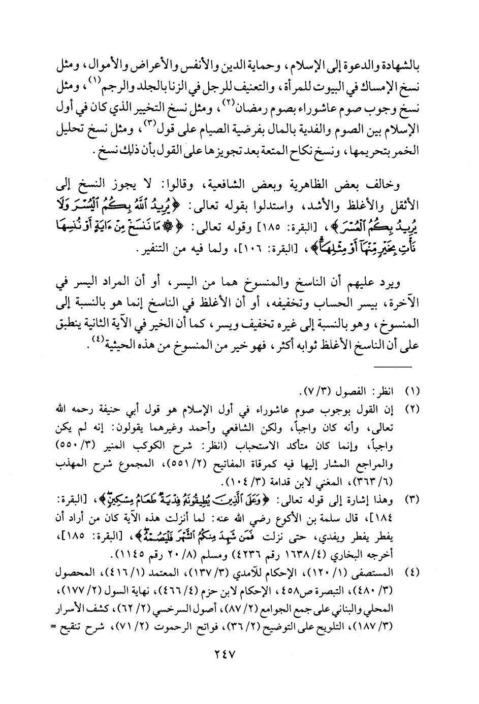 ويرد عليهم أن الناسخ والمنسوخ هما من اليسر، أو أن المراد اليسر في الآخرة، بيسر الحساب وتخفيفه، أو أن الأغلظ في الناسخ إنما هو بالنسبة إلى المنسوخ، وهو بالنسبة إلى غيره تخفيف ويسر، كما أن الخير في الآية الثانية ينطبق على أن الناسخ الأغلظ ثوابه أكثر، فهو خير من المنسوخ من هذه الحيثية (٤).
