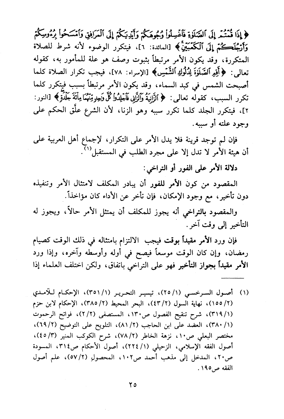 {يَا أَيُّهَا الَّذِينَ آمَنُوا إِذَا قُمْتُمْ إِلَى الصَّلَاةِ فَاغْسِلُوا وُجُوهَكُمْ وَأَيْدِيَكُمْ إِلَى الْمَرَافِقِ وَامْسَحُوا بِرُءُوسِكُمْ وَأَرْجُلَكُمْ إِلَى الْكَعْبَيْنِ} [المائدة: ٦]، فيتكرر الوضوء لأنه شرط للصلاة المتكررة، وقد يكون الأمر مرتبطًا بثبوت وصفط هو علة للمأمور به، كقوله تعالى: {أَقِمِ الصَّلَاةَ لِدُلُوكِ الشَّمْسِ} [الإسراء: ٧٨]، فيجب تكرار الصلاة كلما أصبحت الشمس في كبد السماء، وقد يكون الأمر مرتبطًا بسبب فيتكرر كلما تكرر السبب، كقوله تعالى: {الزَّانِيَةُ وَالزَّانِي فَاجْلِدُوا كُلَّ وَاحِدٍ مِنْهُمَا مِائَةَ جَلْدَةٍ} [النور: ٢]، فيتكرر الجلد كلما تكرر سببه وهو الزنا، لأن الشرع علَّق الحكم على وجود علته أو سببه.