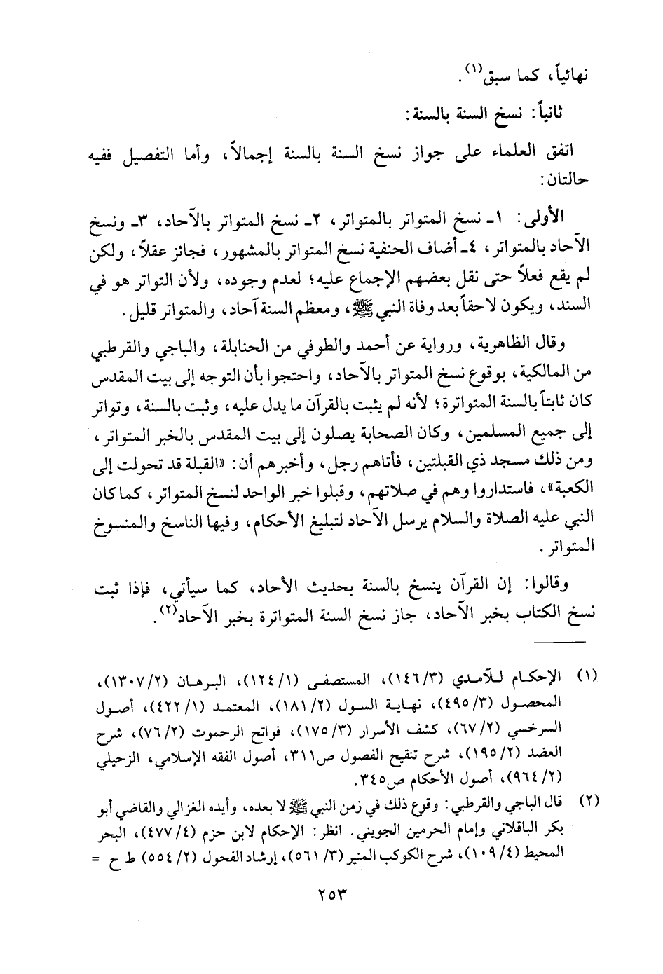 وقال الظاهرية، ورواية عن أحمد والطوفي من الحنابلة، والباجي والقرطبي من المالكية، بوقوع نسخ المتواتر بالآحاد، واحتجوا بأن التوجه إلى بيت المقدس كان ثابتًا بالسنة المتواترة؛ لأنه لم يثبت بالقرآن ما يدل عليه، وثبت بالسنة، وتواتر إلى جميع المسلمين، وكان الصحابة يصلون إلى بيت المقدس بالخبر المتواتر، ومن ذلك مسجد ذي القبلتين، فأتاهم رجل، وأخبرهم أن: "القبلة قد تحولت إلى الكعبة"، فاستداروا وهم في صلاتهم، وقبلوا خبر الواحد لنسخ المتواتر، كما كان النبي عليه الصلاة والسلام يرسل الآحاد لتبليغ الأحكام، وفيها الناسخ والمنسوخ المتواتر.