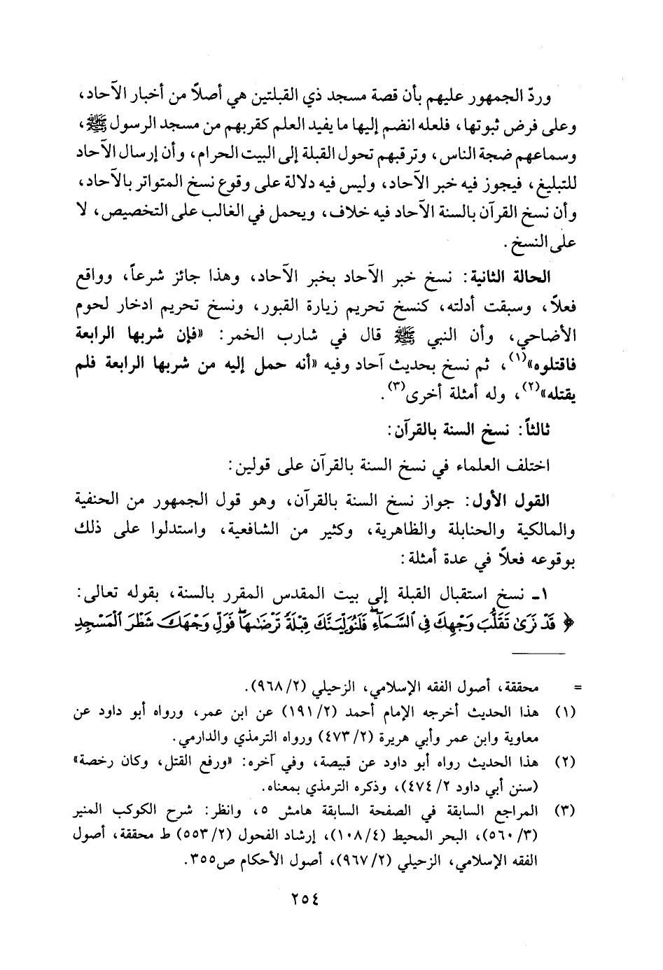 القول الأول: جواز نسخ السنة بالقرآن، وهو قول الجمهور من الحنفية والمالكية والحنابلة والظاهرية، وكئير من الشافعية، واستدلوا على ذلك بوقوعه فعلًا في عدة أمثلة: