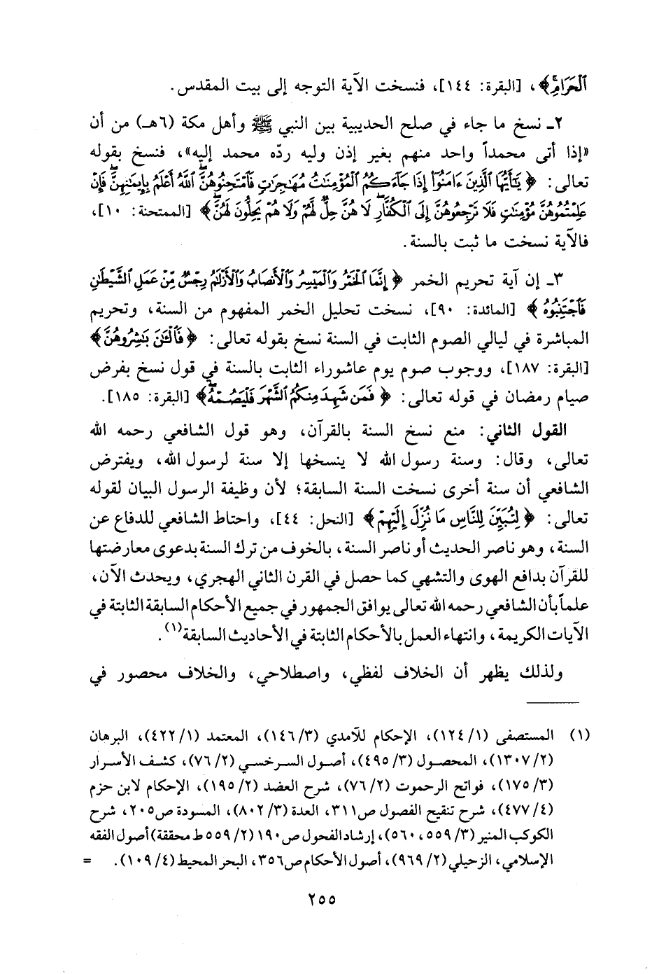 القول الثاني: منع نسخ السنة بالقرآن، وهو قول الشافعي رحمه اللَّه تعالى، وقال: وسنة رسول اللَّه لا ينسخها إلا سنة لرسول اللَّه، ويفترض الشافعي أن سنة أخرى نسخت السنة السابقة؛ لأن وظيفة الرسول البيان لقوله تعالى: {لِتُبَيِّنَ لِلنَّاسِ مَا نُزِّلَ إِلَيْهِمْ} [النحل: ٤٤]، واحتاط الشافعي للدفاع عن السنة، وهو ناصر الحديث أو ناصر السنة، بالخوف من ترك السنة بدعوى معارضتها للقرآن بدافع الهوى والتشهي كما حصل في القرن الثاني الهجري، ويحدث الآن، علمًا بأن الشافعي رحمه اللَّه تعالى يوافق الجمهور في جميع الأحكام السابقة الثابتة في الآيات الكريمة، وانتهاء العمل بالأحكام الثابتة في الأحاديث السابقة (١).