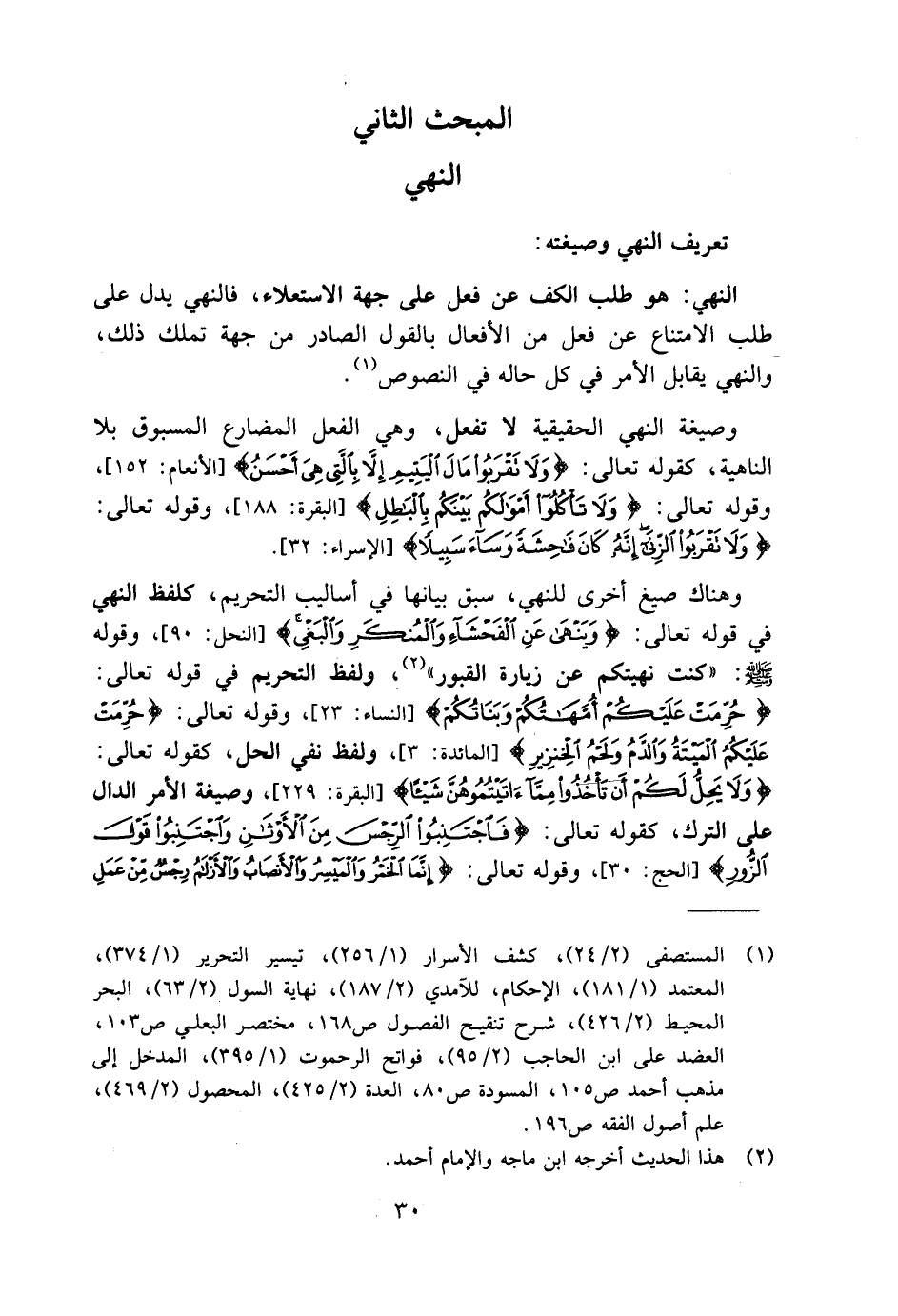 وهناك صيغ أخرى للنهي، سبق بيانها في أساليب التحريم، كلفظ النهي في قوله تعالى: {وَيَنْهَى عَنِ الْفَحْشَاءِ وَالْمُنْكَرِ وَالْبَغْيِ} [النحل: ٩٠]، وقوله - صلى الله عليه وسلم -: "كنت نهيتكم عن زيارة القبور" (٢)، ولفظ التحريم في قوله تعالى: {حُرِّمَتْ عَلَيْكُمْ أُمَّهَاتُكُمْ وَبَنَاتُكُمْ} [النساء: ٢٣]، وقوله تعالى: {حُرِّمَتْ عَلَيْكُمُ الْمَيْتَةُ وَالدَّمُ وَلَحْمُ الْخِنْزِير} [المائدة: ٣]، ولفظ نفي الحل، كقوله تعالى: {وَلَا يَحِلُّ لَكُمْ أَنْ تَأْخُذُوا مِمَّا آتَيْتُمُوهُنَّ شَيْئًا} [البقرة: ٢٢٩]، وصيغة الأمر الدال على الترك، كقوله تعالى: {فَاجْتَنِبُوا الرِّجْسَ مِنَ الْأَوْثَانِ وَاجْتَنِبُوا قَوْلَ الزُّورِ} [الحج: ٣٠]، وقوله تعالى: {إِنَّمَا الْخَمْرُ وَالْمَيْسِرُ وَالْأَنْصَابُ وَالْأَزْلَامُ رِجْسٌ مِنْ عَمَلِ