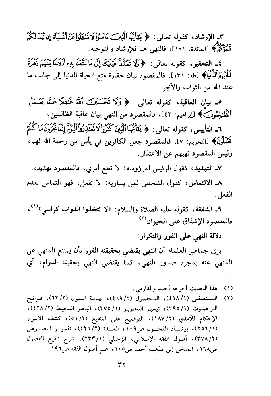 ٣ - الإرشاد، كقوله تعالى: {يَا أَيُّهَا الَّذِينَ آمَنُوا لَا تَسْأَلُوا عَنْ أَشْيَاءَ إِنْ تُبْدَ لَكُمْ تَسُؤْكُمْ} [المائدة: ١٠١]، فالنهي هنا فلإرشاد والتوجيه.