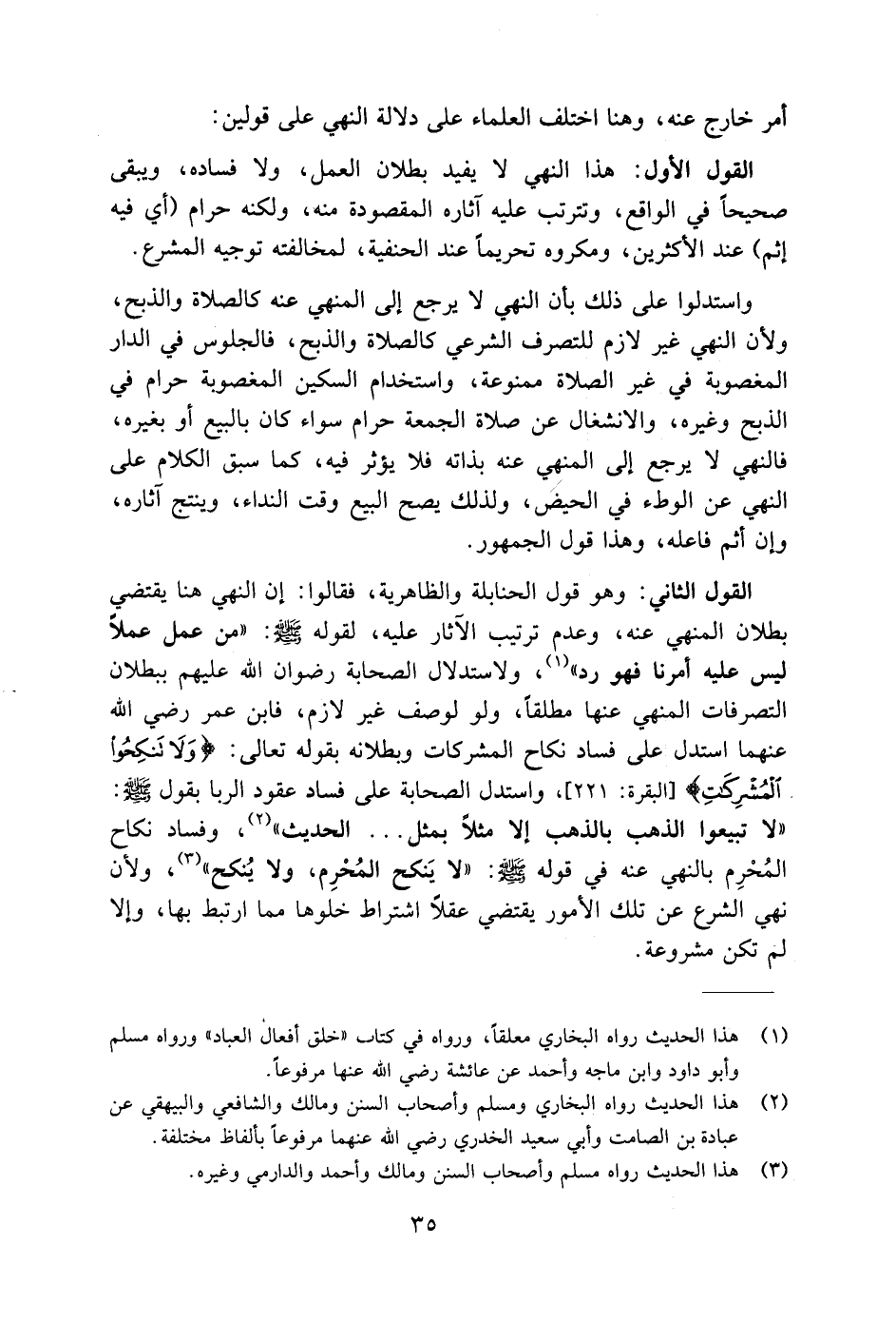 القول الثاني: وهو قول الحنابلة والظاهرية، فقالوا: إن النهي هنا يقتضي بطلان المنهي عنه، وعدم ترتيب الآثار عليه، لقوله - صلى الله عليه وسلم -: "من عمل عملًا ليس عليه أمرنا فهو رد" (١)، ولاستدلال الصحابة رضوان اللَّه عليهم ببطلان التصرفات المنهي عنها مطلقًا، ولو لوصف غير لازم، فابن عمر رضي اللَّه عنهما استدل على فساد نكاح المشركات وبطلانه بقوله تعالى: {وَلَا تَنْكِحُوا الْمُشْرِكَاتِ} [البقرة: ٢٢١]، واستدل الصحابة على فساد عقود الربا بقول - صلى الله عليه وسلم -: "لا تبيعوا الذهب بالذهب إلا مثلًا بمثل ... الحديث" (٢)، وفساد نكاح المُحْرِم بالنهي عنه في قوله - صلى الله عليه وسلم -: "لا يَنكح المُحْرِم، ولا يُنكح" (٣)، ولأن نهي الشرع عن تلك الأمور يقتضي عقلًا اشتراط خلوها مما ارتبط بها، وإلا لم تكن مشروعة.