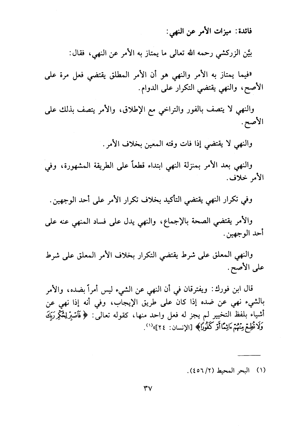 "فيما يمتاز به الأمر والنهي هو أن الأمر المطلق يقتضي فعل مرة على الأصح، والنهي يقتضي التكرار على الدوام.