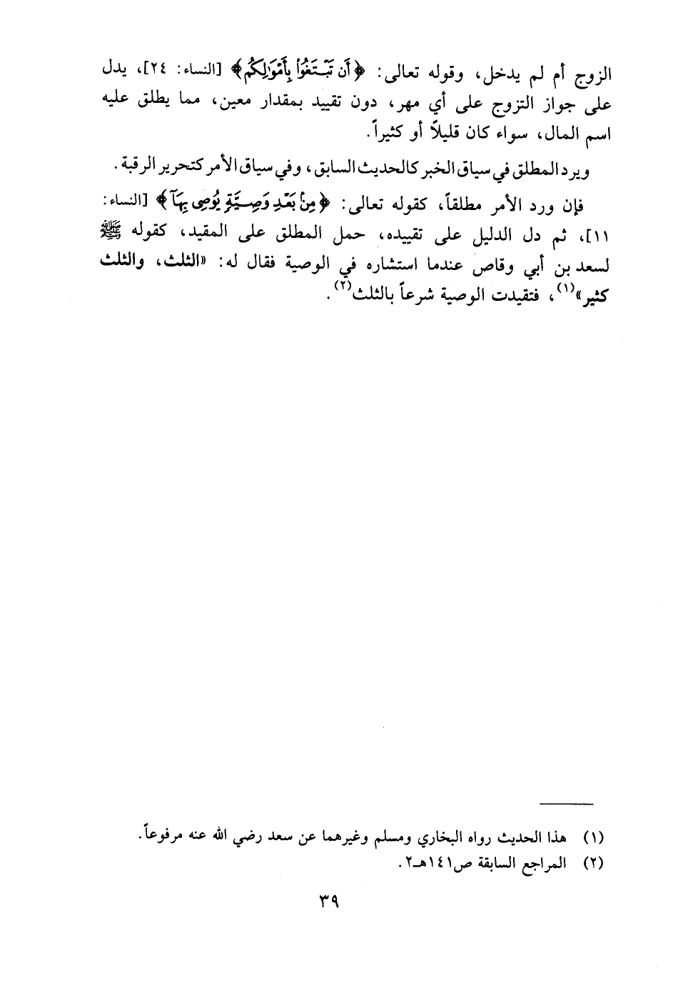 فإن ورد الأمر مطلقًا، كقوله تعالى: {مِنْ بَعْدِ وَصِيَّةٍ يُوصَى بِهَا} [النساء: ١١]، ثم دل الدليل على تقييده، حمل المطلق على المقيد، كقوله - صلى الله عليه وسلم - لسعد بن أبي وقاص عندما استشاره في الوصية فقال له: "الثلث، والثلث كثير" (١)، فتقيدت الوصية شرعًا بالثلث (٢).