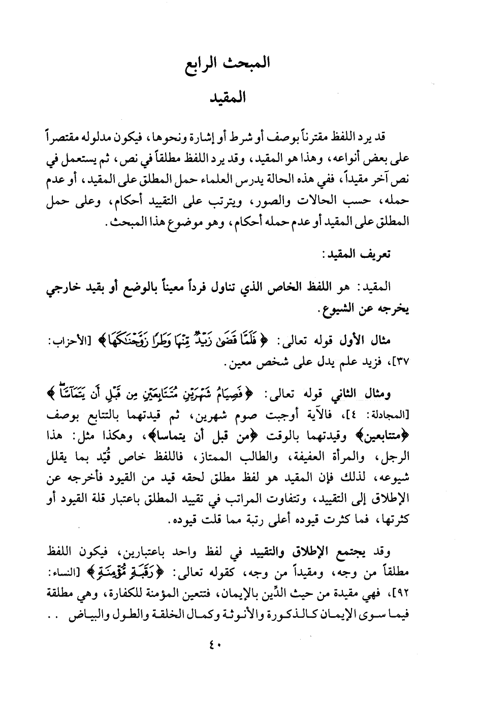 ومثال الثاني قوله تعالى: {فَصِيَامُ شَهْرَيْنِ مُتَتَابِعَيْنِ مِنْ قَبْلِ أَنْ يَتَمَاسَّا} [المجادلة: ٤]، فالآية أوجبت صوم شهرين، ثم قيدتهما بالتتابع بوصف {مُتَتَابِعَيْنِ} وقيدتهما بالوقت {مِنْ قَبْلِ أَنْ يَتَمَاسَّا}، وهكذا مثل: هذا الرجل، والمرأة العفيفة، والطالب الممتاز، فاللفظ خاص قُيّد بما يقلل شيوعه، لذلك فإن المقيد هو لفظ مطلق لحقه قيد من القيود فأخرجه عن الإطلاق إلى التقييد، وتتفاوت المراتب في تقييد المطلق باعتبار قلة القيود أو كثرتها، فما كثرت قيوده أعلى رتبة مما قلت قيوده.