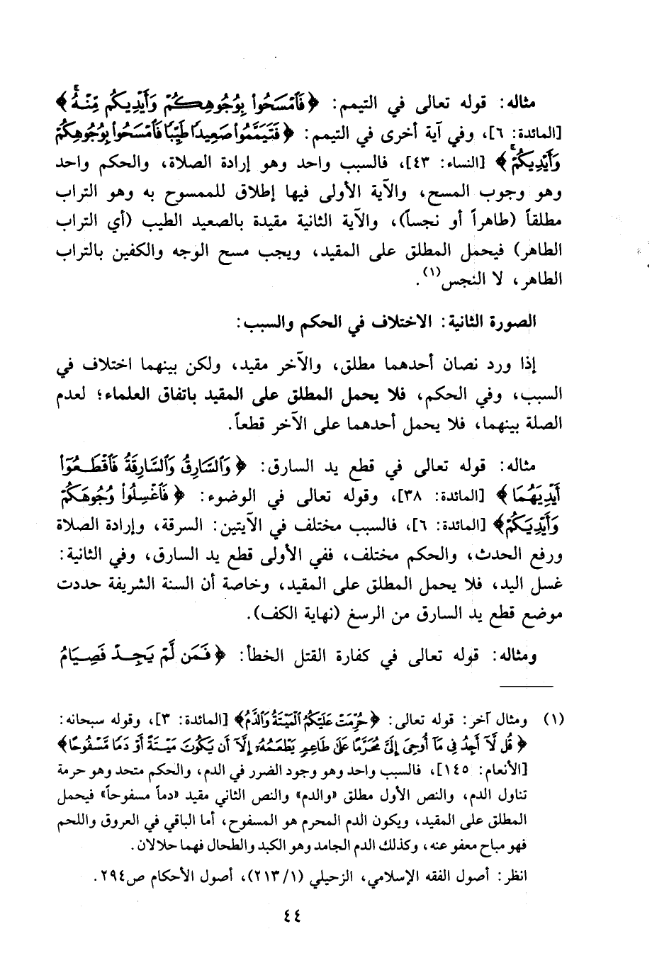 (١) ومثال آخر: قوله تعالى: {حُرِّمَتْ عَلَيْكُمُ الْمَيْتَةُ وَالدَّمُ} [المائدة: ٣]، وقوله سبحانه: {قُلْ لَا أَجِدُ فِي مَا أُوحِيَ إِلَيَّ مُحَرَّمًا عَلَى طَاعِمٍ يَطْعَمُهُ إلا أَنْ يَكُونَ مَيْتَةً أَوْ دَمًا مَسْفُوحًا} [الأنعام: ١٤٥]، فالسبب واحد وهو وجود الضرر في الدم، والحكم متحد وهو حرمة تناول الدم، والنص الأول مطلق "والدم" والنص الثاني مقيد "دمًا مسفوحًا" فيحمل المطلق على المقيد، ويكون الدم المحرم هو المسفوح، أما الباقي في العروق واللحم فهو مباح معفو عنه، وكذلك الدم الجامد وهو الكبد والطحال فهما حلالان.