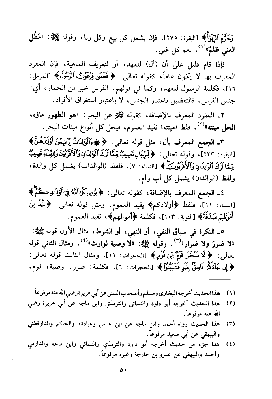 ٤ - الجمع المعرف بالإضافة، كقوله تعالى: {يُوصِيكُمُ اللَّهُ فِي أَوْلَادِكُمْ} [النساء: ١١]، فلفظ {أَوْلَادِكُمْ} يفيد العموم، ومثل قوله تعالى: {خُذْ مِنْ أَمْوَالِهِمْ صَدَقَةً} [التوبة: ١٠٣]، فكلمة {أَمْوَالِهِمْ}، تفيد العموم.