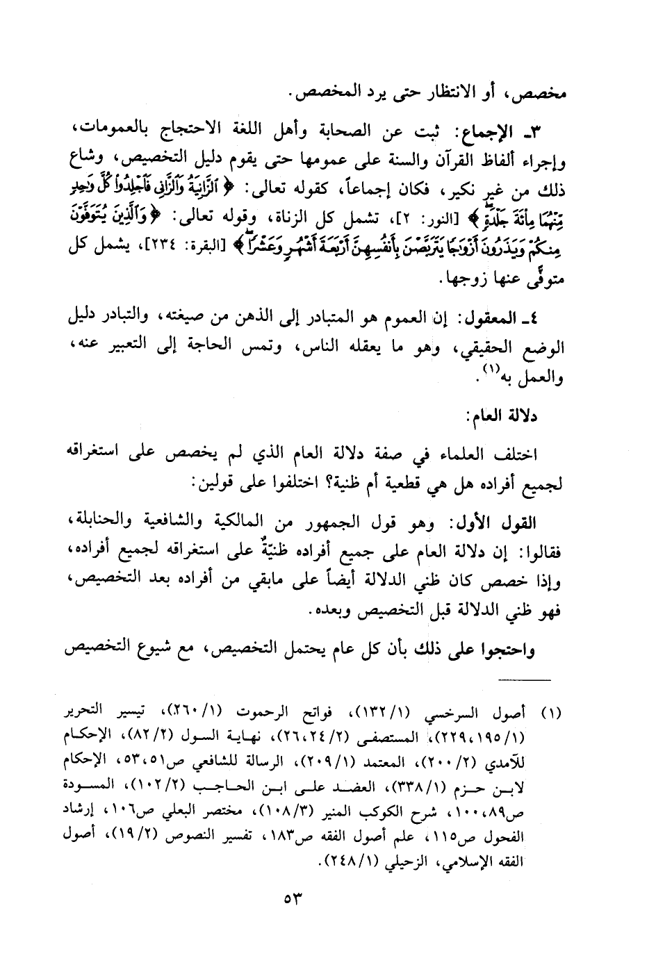 ٣ - الإجماع: ثبت عن الصحابة وأهل اللغة الاحتجاج بالعمومات، وإجراء ألفاظ القرآن والسنة على عمومها حتى يقوم دليل التخصيص، وشاع ذلك من غير نكير، فكان إجماعًا، كقوله تعالى: {الزَّانِيَةُ وَالزَّانِي فَاجْلِدُوا كُلَّ وَاحِدٍ مِنْهُمَا مِائَةَ جَلْدَةٍ} [النور: ٢]، تشمل كل الزناة، وقوله تعالى: {وَالَّذِينَ يُتَوَفَّوْنَ مِنْكُمْ وَيَذَرُونَ أَزْوَاجًا يَتَرَبَّصْنَ بِأَنْفُسِهِنَّ أَرْبَعَةَ أَشْهُرٍ وَعَشْرًا} [البقرة: ٢٣٤]، يشمل كل متوفًّى عنها زوجها.