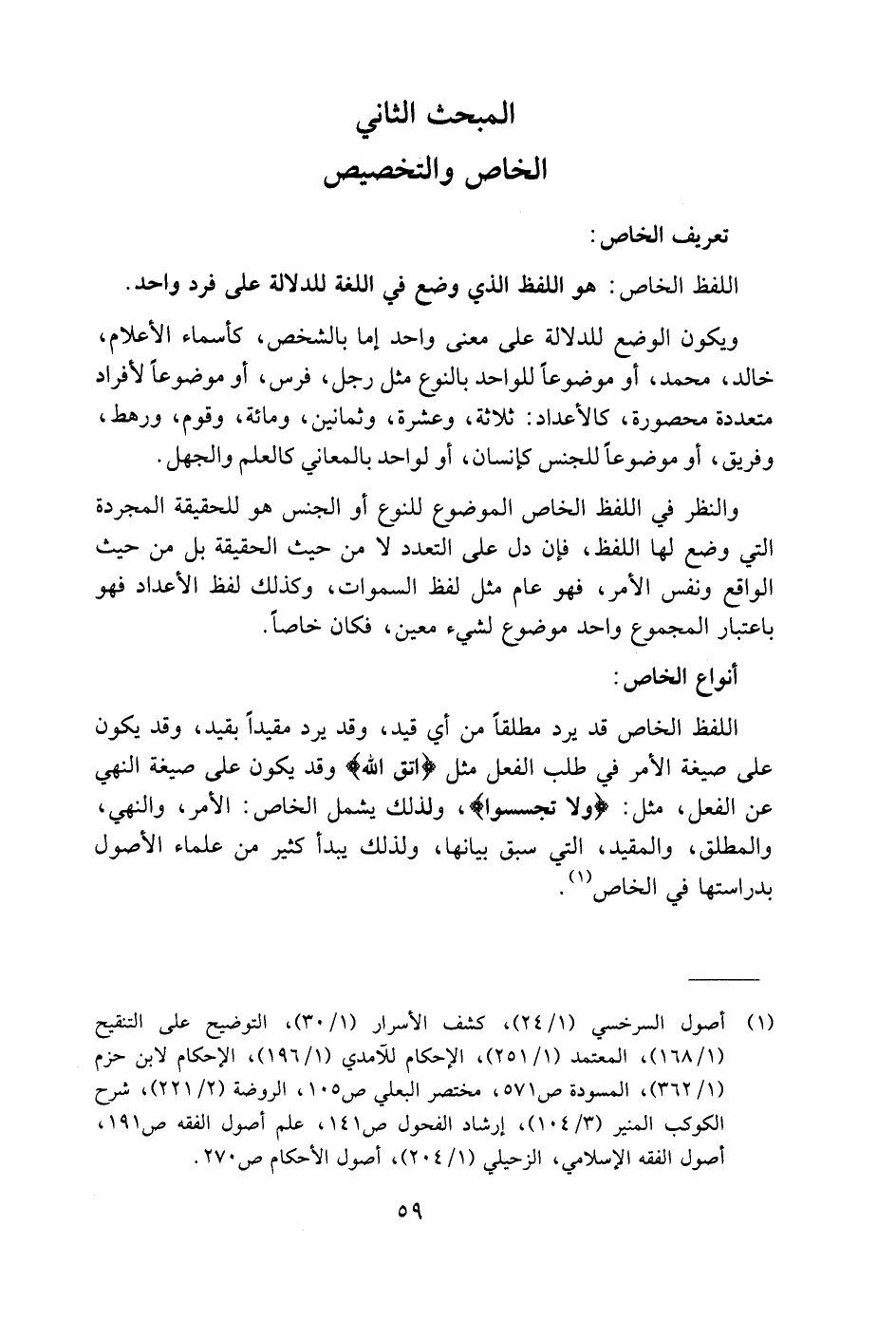 اللفظ الخاص قد يرد مطلقًا من أي قيد، وقد يرد مقيدًا بقيد، وقد يكون على صيغة الأمر في طلب الفعل مثل {اتَّقِ اللَّهَ} وقد يكون على صيغة النهي عن الفعل، مثل: {وَلَا تَجَسَّسُوا}، ولذلك يشمل الخاص: الأمر، والنهي، والمطلق، والمقيد، التي سبق بيانها، ولذلك يبدأ كثير من علماء الأصول بدراستها في الخاص (١).