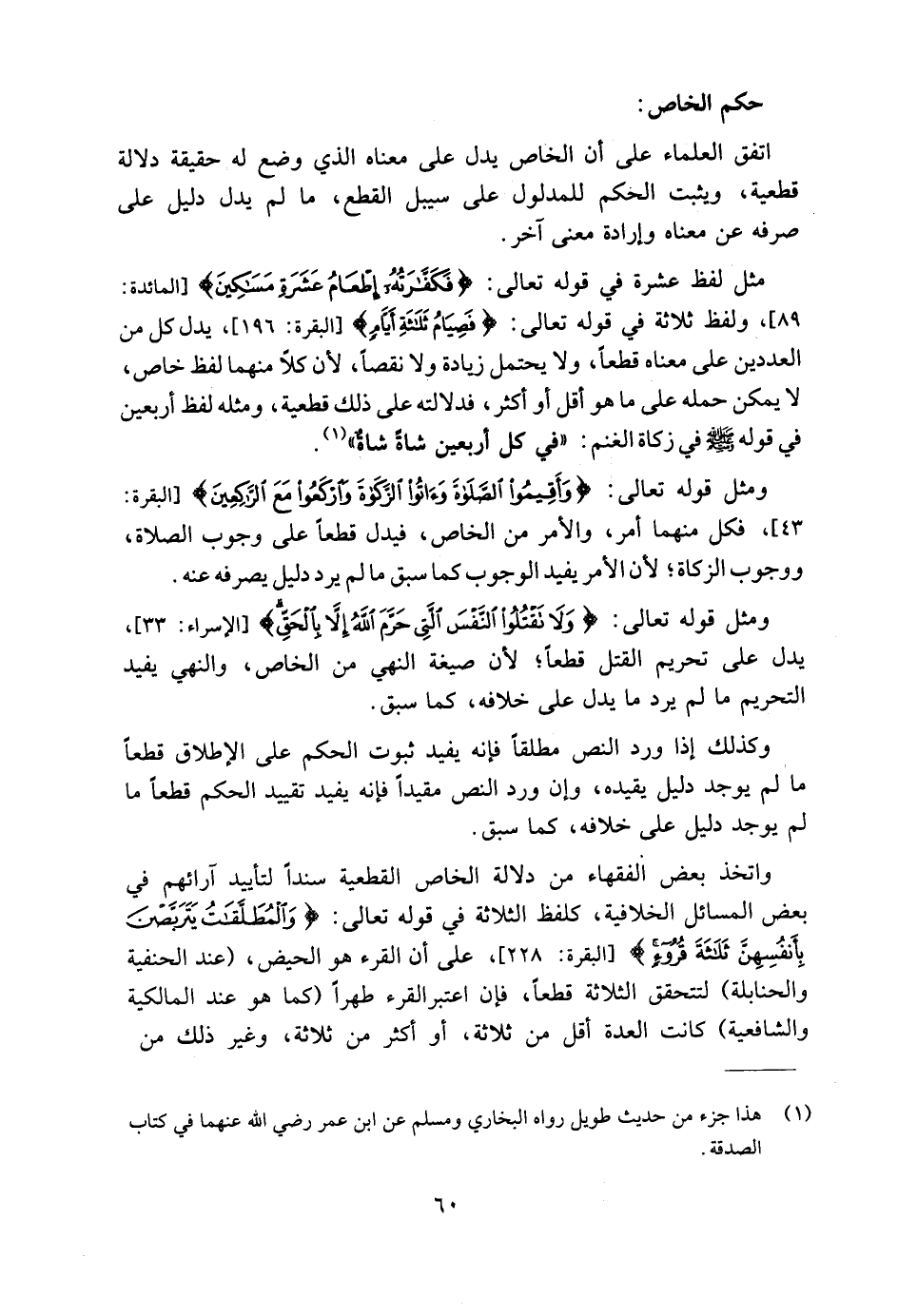 واتخذ بعض الفقهاء من دلالة الخاص القطعية سندًا لتأييد آرائهم في بعض المسائل الخلافية، كلفظ الثلاثة في قوله تعالى: {وَالْمُطَلَّقَاتُ يَتَرَبَّصْنَ بِأَنْفُسِهِنَّ ثَلَاثَةَ قُرُوءٍ} [البقرة: ٢٢٨]، على أن القرء هو الحيض، (عند الحنفية والحنابلة) لتتحقق الثلاثة قطعًا، فإن اعتبر القرء طهرًا (كما هو عند المالكية والشافعية) كانت العدة أقل من ثلاثة، أو أكثر من ثلاثة، وغير ذلك من