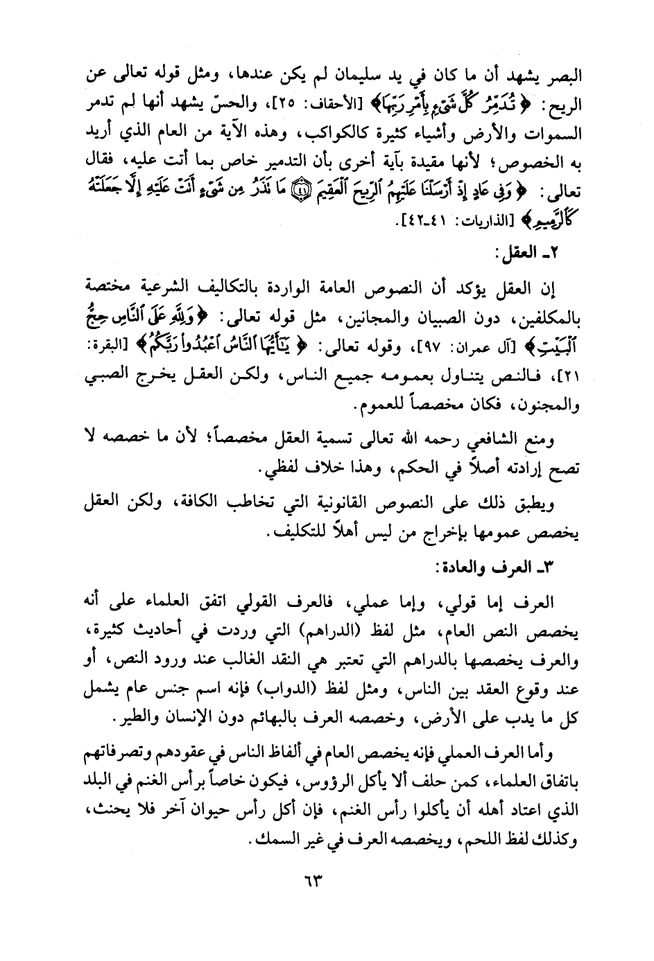 ويطبق ذلك على النصوص القانونية التي تخاطب الكافة، ولكن العقل يخصص عمومها بإخراج من ليس أهلًا للتكليف.