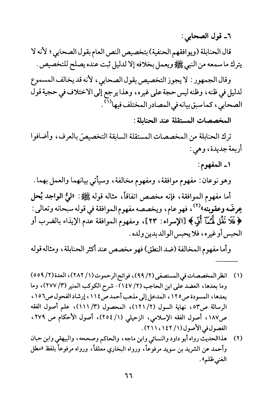أما مفهوم الموافقة، فإنه مخصص اتفاقًا، مثاله قوله - صلى الله عليه وسلم -: "ليُّ الواجد يُحل عِرضَه وعقوِبته" (٢)، فهو عام، ويخصصه مفهوم الموافقة في قوله سبحانه وتعالى: {فَلَا تَقُلْ لَهُمَا أُفٍّ} [الإسراء: ٢٣]، ومفهوم الموافقة عدم الإيذاء بالضرب أو الحبس أو غيره، فلا يحبس الوالد بدين ولده.