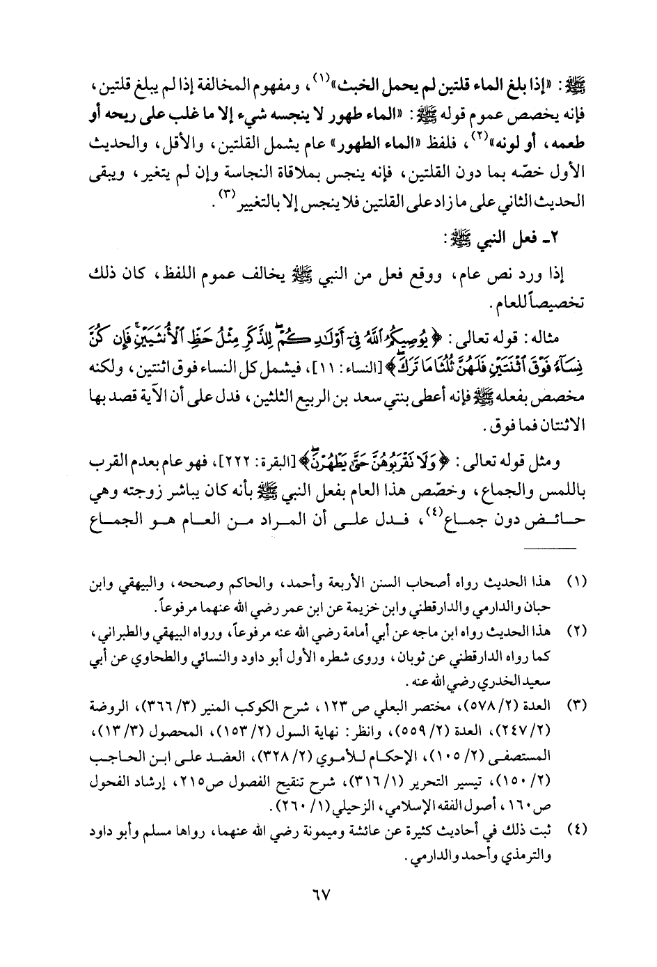 - صلى الله عليه وسلم -: "إذا بلغ الماء قلتين لم يحمل الخبث" (١)، ومفهوم المخالفة إذا لم يبلغ قلتين، فإنه يخصص عموم قوله - صلى الله عليه وسلم -: "الماء طهور لا ينجسه شيء إلا ما غلب على ريحه أو طعمه، أو لونه" (٢)، فلفظ "الماء الطهور" عام يشمل القلتين، والأقل، والحديث الأول خصّه بما دون القلتين، فإنه ينجس بملاقاة النجاسة وإن لم يتغير، ويبقى الحديث الثاني على ما زاد على القلتين فلا ينجس إلا بالتغيير (٣).