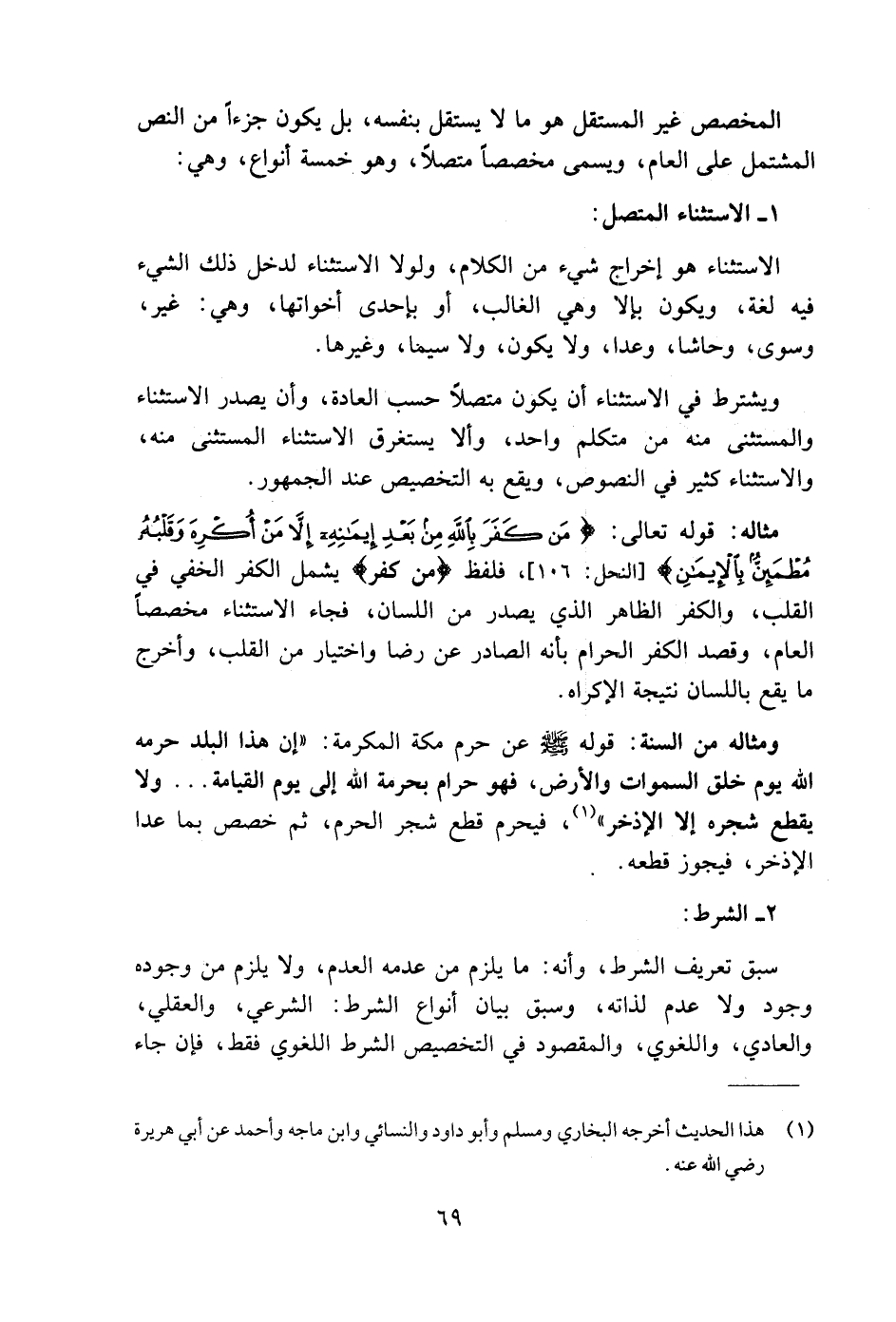 ويشترط في الاستثناء أن يكون متصلًا حسب العادة، وأن يصدر الاستثناء والمستثنى منه من تكلم واحد، وألا يستغرق الاستثناء المستثنى منه، والاستثناء كثير في النصوص، ويقع به التخصيص عند الجمهور.