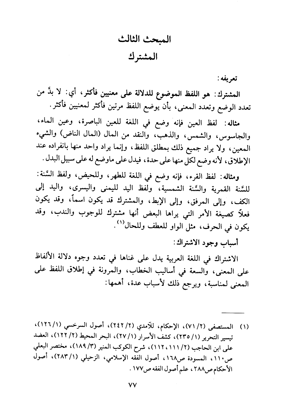 ومثاله: لفظ القرء، فإنه وضع في اللغة للطهر، وللحيض، ولفظ السَّنة: للسَّنة القمرية والسَّنة الشمسية، ولفظ اليد لليمنى واليسرى، واليد إلى الكف، وإلى المرفق، وإلى الإبط، والمشترك قد يكون اسمًا، وقد يكون فعلًا كصيغة الأمر التي يراها البعض أنها مشترك للوجوب والندب، وقد يكون في الحرف، مثل الواو للعطف وللحال (١).