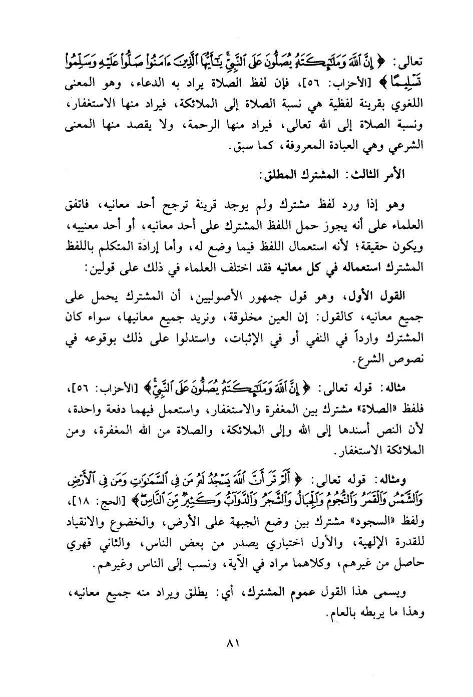 تعالى: {إِنَّ اللَّهَ وَمَلَائِكَتَهُ يُصَلُّونَ عَلَى النَّبِيِّ يَا أَيُّهَا الَّذِينَ آمَنُوا صَلُّوا عَلَيْهِ وَسَلِّمُوا تَسْلِيمًا (٥٦)} [الأحزاب: ٥٦]، فإن لفظ الصلاة يراد به الدعاء، وهو المعنى اللغوي بقرينة لفظية هي نسبة الصلاة إلى الملائكة، فيراد منها الاستغفار، ونسبة الصلاة إلى اللَّه تعالى، فيراد منها الرحمة، ولا يقصد منها المعنى الشرعي وهي العبادة المعروفة، كما سبق.