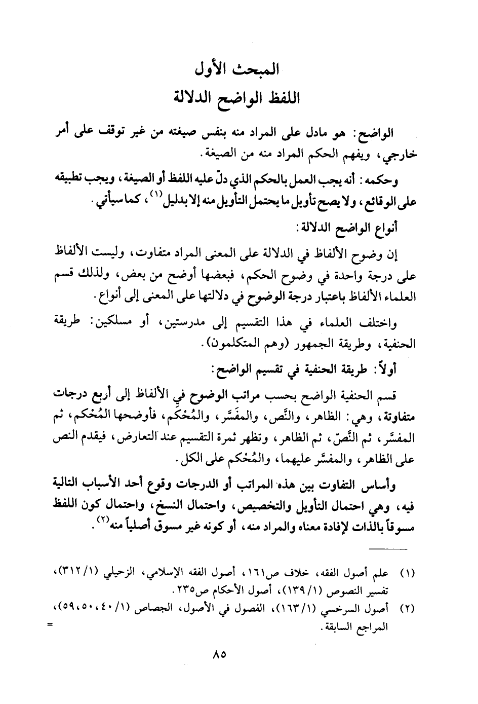 قسم الحنفية الواضح بحسب مراتب الوضوح في الألفاظ إلى أربع درجات متفاوتة، وهي: الظاهر، والنَّص، والمفَسَّر، والمُحْكَم، فأوضحها المُحْكم، ثم المفسَّر، ثم النَّصّ ثم الظاهر، وتظهر ثمرة التقسيم عند التعارض، فيقدم النص على الظاهر، والمفسَّر عليهما، والمُحْكم على الكل.