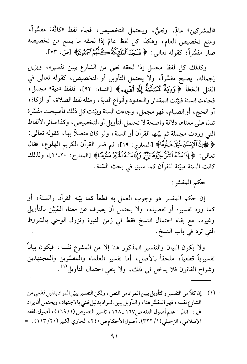 وكذلك كل لفظ مجمل إذا لحقه نص من الشارع يبين تفسيره، ويزيل إجماله، يصبح مفسَّرًا، ولا يحتمل التأويل أو التخصيص، كقوله تعالى في القتل الخطأ {وَدِيَةٌ مُسَلَّمَةٌ إِلَى أَهْلِهِ} [النساء: ٩٢]، فلفظ "دية" مجمل، فجاءت السنة فبيَّنت المقدار والحدود وأنواع الدية، ومثله لفظ الصلاة، أو الزكاة، أو الحج، أو الصيام، فهو مجمل، وجاءت السنة وبيَّنت كل ذلك فأصبحت مفسَّرة تدل على معناها دلالة واضحة لا تحتمل التأويل أو التخصيص، وكذا سائر الألفاظ التي وردت مجملة ثم بيّنها القرآن أو السنة، ولو كان متصلًا بها، كقوله تعالى: {إِنَّ الْإِنْسَانَ خُلِقَ هَلُوعًا (١٩)} [المعارج: ١٩]، ثم فسر القرآن الكريم الهلوع، فقال تعالى: {إِذَا مَسَّهُ الشَّرُّ جَزُوعًا (٢٠) وَإِذَا مَسَّهُ الْخَيْرُ مَنُوعًا} [المعارج: ٢٠ - ٢١]، ولذلك كانت السنة مبيّنة للقرآن كما سبق في بحث السّنة.