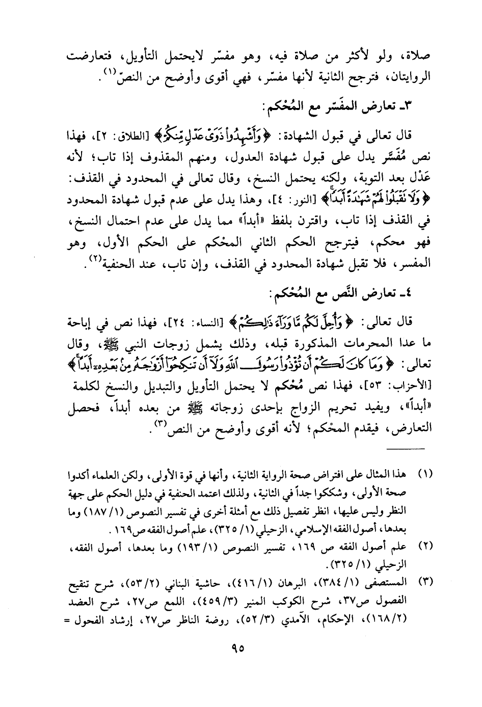 قال تعالى في قبول الشهادة: {وَأَشْهِدُوا ذَوَيْ عَدْلٍ مِنْكُمْ} [الطلاق: ٢]، فهذا نص مُفَسَّر يدل على قبول شهادة العدول، ومنهم المقذوف إذا تاب؛ لأنه عَدْل بعد التوبة، ولكنه يحتمل النسخ، وقال تعالى في المحدود في القذف: {وَلَا تَقْبَلُوا لَهُمْ شَهَادَةً أَبَدًا} [النور: ٤]، وهذا يدل على عدم قبول شهادة المحدود في القذف إذا تاب، واقترن بلفظ "أبدًا" مما يدل على عدم احتمال النسخ، فهو محكم، فيترجح الحكم الثاني المحْكم على الحكم الأول، وهو المفسر، فلا تقبل شهادة المحدود في القذف، وإن تاب، عند الحنفية (٢).