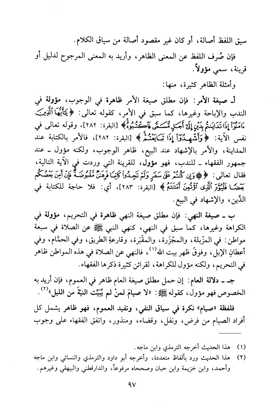 جـ- دلالة العام: إن حمل مطلق صيغة العام ظاهر في العموم، فإن أريد به الخصوص فهو مؤول، كقوله - صلى الله عليه وسلم -: "لا صيامَ لمنْ لم يُبَيِّت النيّةَ من الليل" (٢).