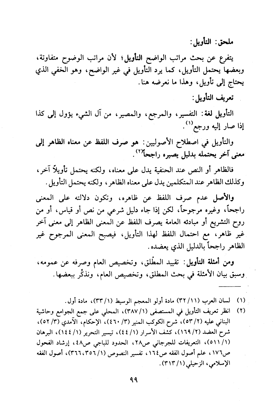 (٢) انظر تعريف التأويل في المستصفى (١/ ٣٨٧)، المحلي على جمع الجوامع وحاشية البناني عليه (٢/ ٥٣)، شرح الكوكب المنير (٣/ ٤٦٠)، الإحكام، الآمدي (٣/ ٥٢)، شرح العضد (٢/ ١٦٩)، كشف الأسرار (١/ ٤٤)، تيسير التحرير (١/ ١٤٤)، البرهان (١/ ٥١١)، التعريفات للجرجاني ص ٢٨، الحدود للباجي ص ٤٨، إرشاد الفحول ص ١٧٦، علم أصول الفقه ص ١٦٤، تفسير النصوص (١/ ٣٥٦، ٣٦٦)، أصول الفقه الإسلامي، الزحيلي (١/ ٣١٣).