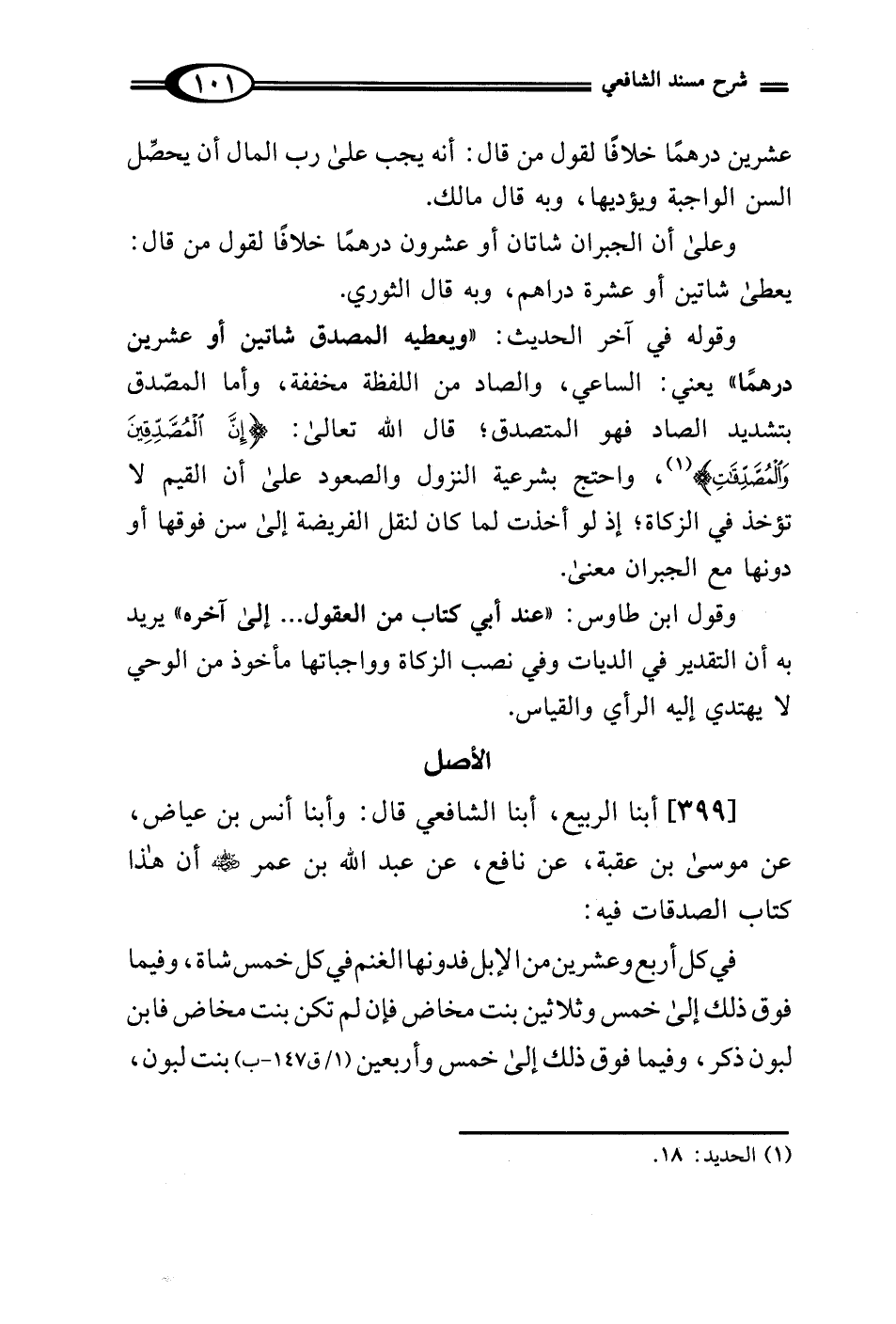 [399] أبنا الربيع، أبنا الشافعي قال: وأبنا أنس بن عياض، عن موسى بن عقبة، عن نافع، عن عبد الله بن عمر -رضي الله عنه- أن هذا كتاب الصدقات فيه: