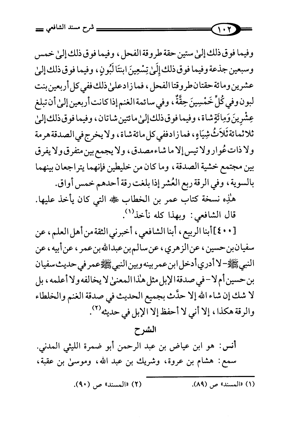 [400] أبنا الربيع، أبنا الشافعي، أخبرني الثقة من أهل العلم، عن سفيان بن حسين، عن الزهري، عن سالم بن عبد الله بن عمر، عن أبيه، عن النبي - صلى الله عليه وسلم -لا أدري أدخل ابن عمر بينه وبين النبي - صلى الله عليه وسلم - عمر في حديث سفيان بن حسين أم لا- في صدقة الإبل مثل هذا المعنى لا يخالفه ولا أعلمه، بل لا شك إن شاء الله إلا حدَّث بجميع الحديث في صدقة الغنم والخلطاء والرقة هكذا، إلا أني لا أحفظ إلا الإبل في حديثه (¬2).