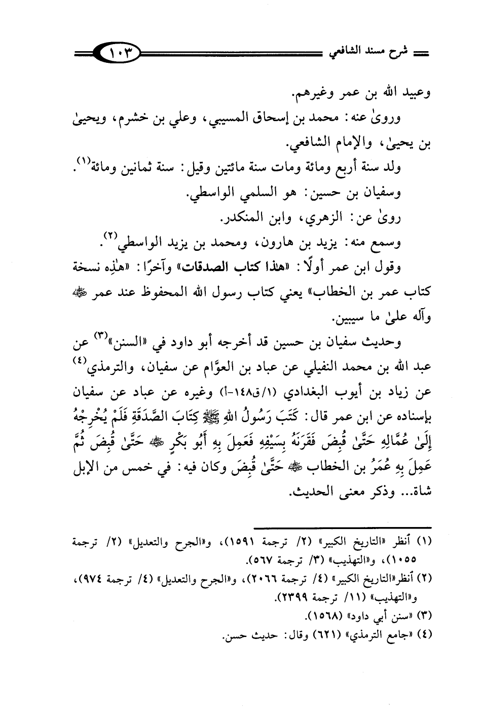 وحديث سفيان بن حسين قد أخرجه أبو داود في "السنن" (¬3) عن عبد الله بن محمَّد النفيلي عن عباد بن العوَّام عن سفيان، والترمذي (¬4) عن زياد بن أيوب البغدادي وغيره عن عباد عن سفيان بإسناده عن ابن عمر قال: كَتَبَ رَسُولُ اللهِ - صلى الله عليه وسلم - كِتَابَ الصَّدَقَةِ فَلَمْ يُخْرِجْهُ إلى عُمَّالِهِ حَتَّى قُبِضَ فَقَرَنَهُ بِسَيْفِهِ فَعَمِلَ بِهِ أَبُو بَكْرٍ -رضي الله عنه- حَتَّى قُبِضَ ثُمَّ عَمِلَ بِهِ عُمَرُ بن الخطاب -رضي الله عنه- حَتَّى قُبِضَ وكان فيه: في خمس من الإبل شاة ... وذكر معنى الحديث.