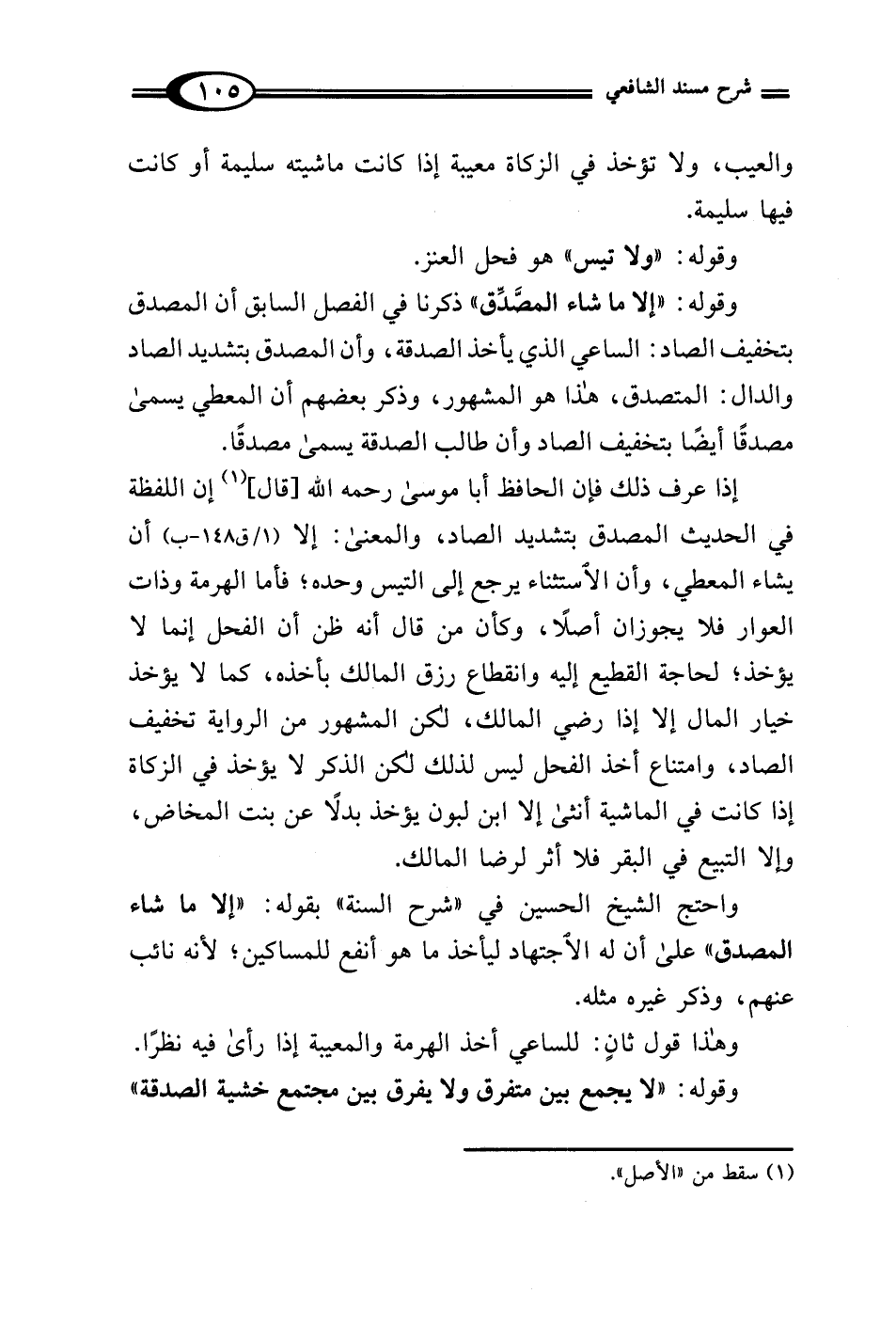 إذا عرف ذلك فإن الحافظ أبا موسى رحمه الله [قال] (¬1) إن اللفظة في الحديث المصدق بتشديد الصاد، والمعنى: إلا أن يشاء المعطي، وأن الاستثناء يرجع إلى التيس وحده؛ فأما الهرمة وذات العوار فلا يجوزان أصلًا، وكأن من قال أنه ظن أن الفحل إنما لا يؤخذ؛ لحاجة القطيع إليه وانقطاع رزق المالك بأخذه، كما لا يؤخذ خيار المال إلا إذا رضي المالك، لكن المشهور من الرواية تخفيف الصاد، وامتناع أخذ الفحل ليس لذلك لكن الذكر لا يؤخذ في الزكاة إذا كانت في الماشية أنثى إلا ابن لبون يؤخذ بدلًا عن بنت المخاض، وإلا التبيع في البقر فلا أثر لرضا المالك.