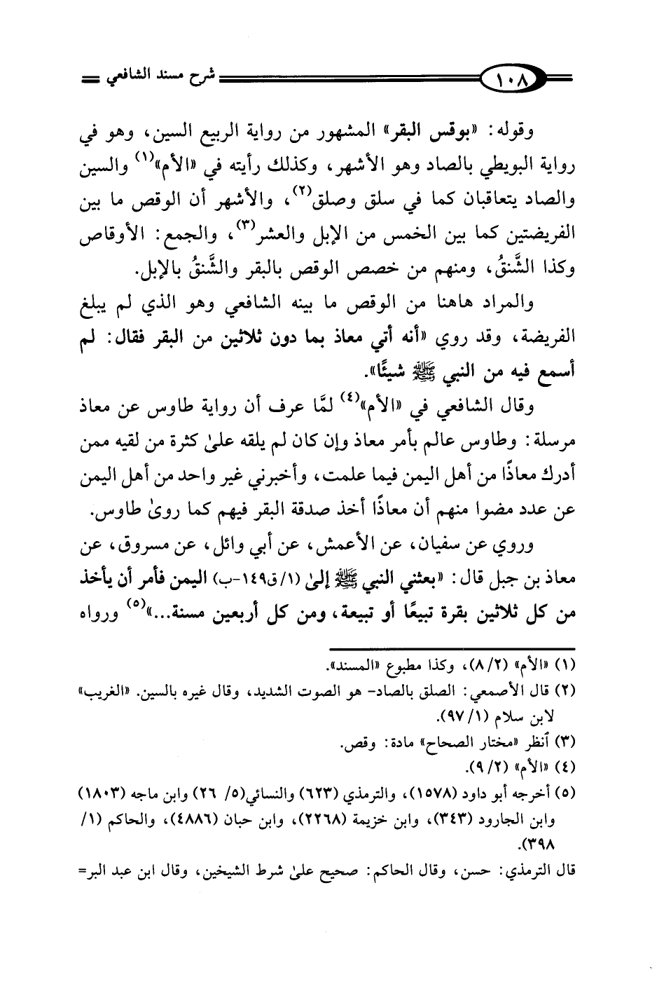 وقوله: "بوقس البقر" المشهور من رواية الربيع السين، وهو في رواية البويطي بالصاد وهو الأشهر، وكذلك رأيته في "الأم" (¬1) والسين والصاد يتعاقبان كما في سلق وصلق (¬2)، والأشهر أن الوقص ما بين الفريضتين كما بين الخمس من الإبل والعشر (¬3)، والجمع: الأوقاص وكذا الشَّنقُ، ومنهم من خصص الوقص بالبقر والشَّنقُ بالإبل.