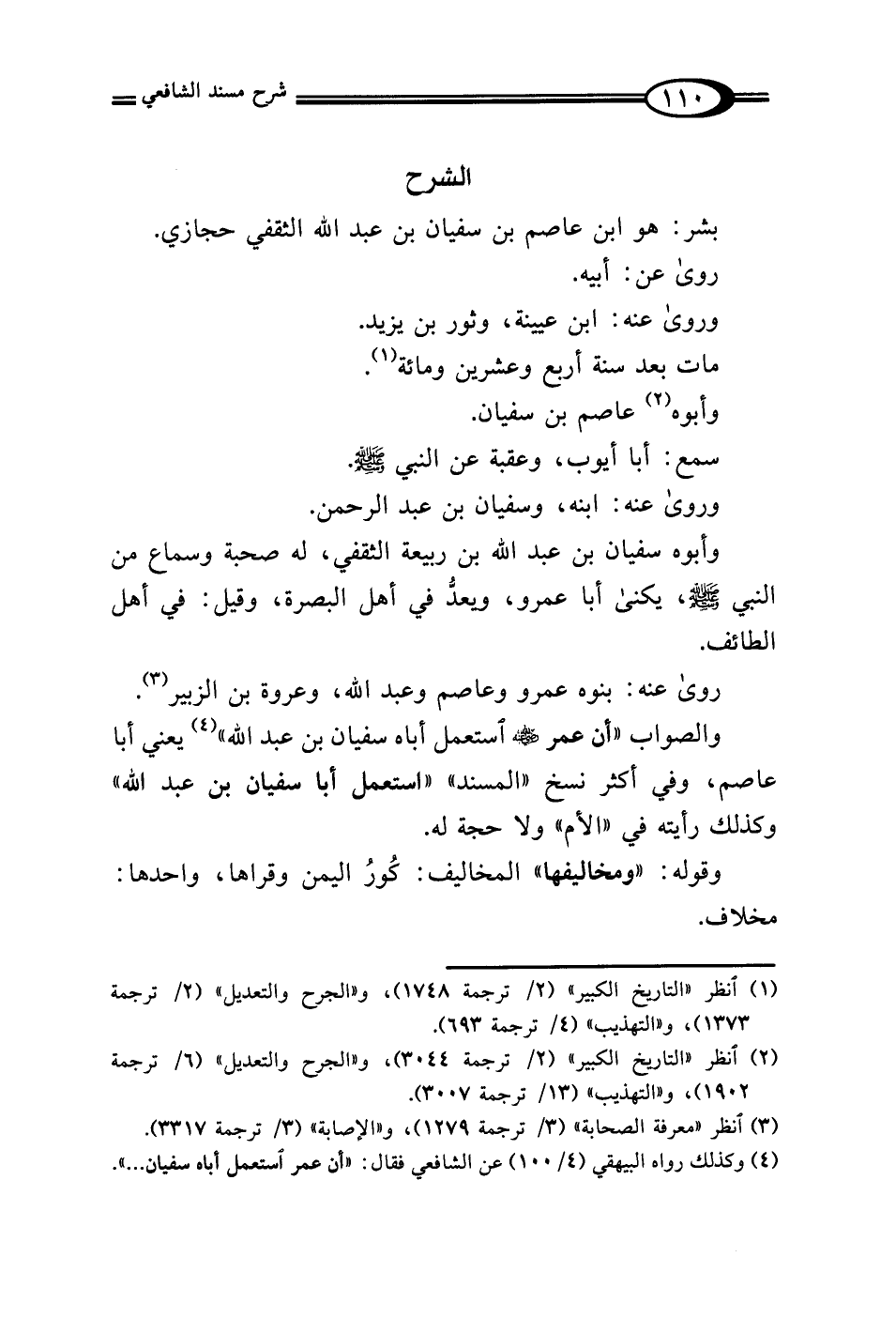 والصواب "أن عمر -رضي الله عنه- استعمل أباه سفيان بن عبد الله" (¬4) يعني أبا عاصم، وفي أكثر نسخ "المسند" "استعمل أبا سفيان بن عبد الله" وكذلك رأيته في "الأم" ولا حجة له.