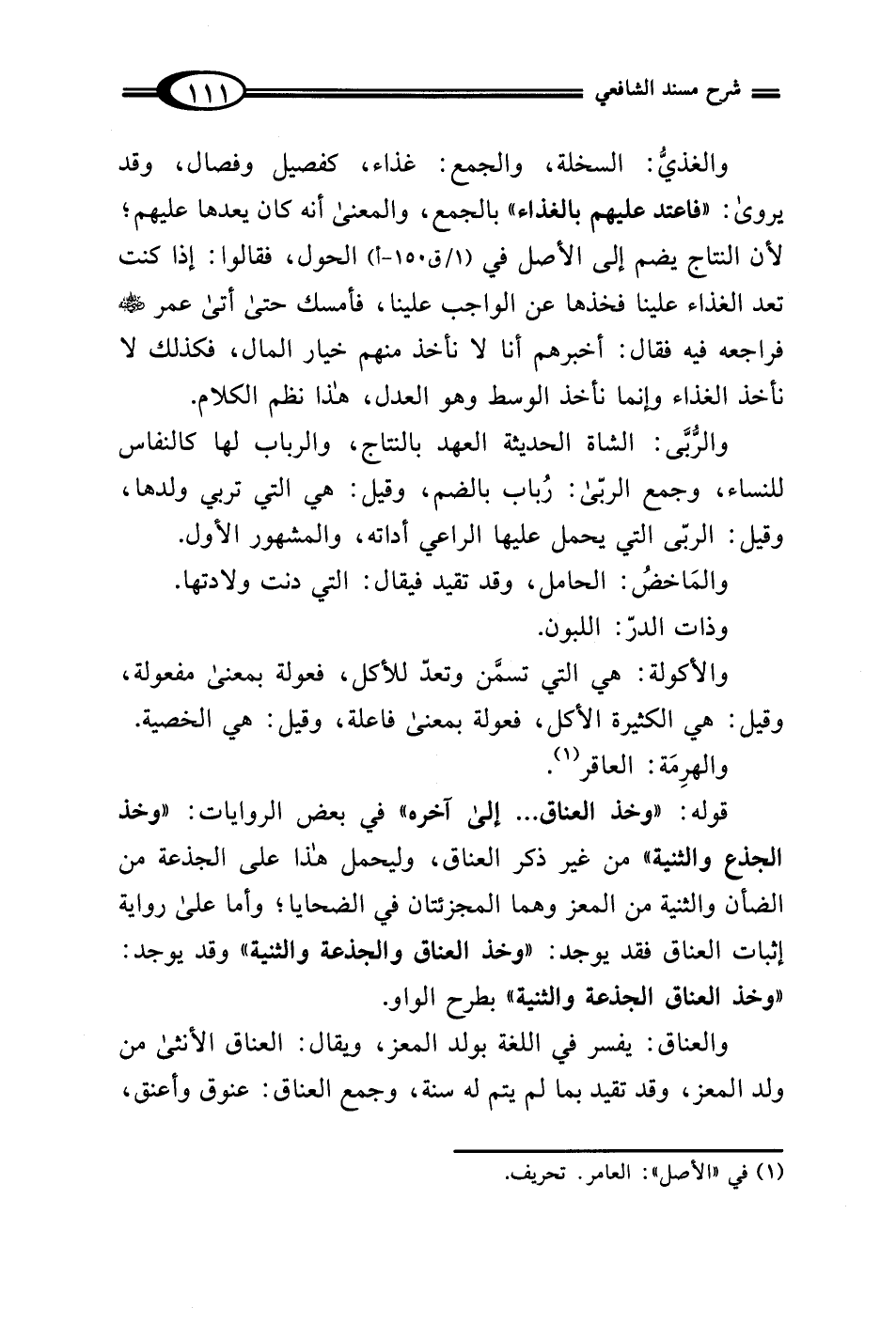 والغذيُّ: السخلة، والجمع: غذاء، كفصيل وفصال، وقد يروى: "فاعتد عليهم بالغذاء" بالجمع، والمعنى أنه كان يعدها عليهم؛ لأن النتاج يضم إلى الأصل في الحول، فقالوا: إذا كنت تعد الغذاء علينا فخذها عن الواجب علينا، فأمسك حتى أتى عمر -رضي الله عنه- فراجعه فيه فقال: أخبرهم أنا لا نأخذ منهم خيار المال، فكذلك لا نأخذ الغذاء وإنما نأخذ الوسط وهو العدل، هذا نظم الكلام.