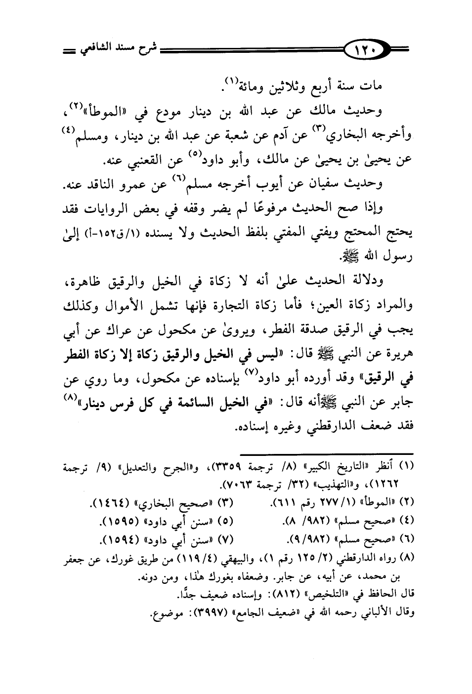 ودلالة الحديث على أنه لا زكاة في الخيل والرقيق ظاهرة، والمراد زكاة العين؛ فأما زكاة التجارة فإنها تشمل الأموال وكذلك يجب في الرقيق صدقة الفطر، ويروى عن مكحول عن عراك عن أبي هريرة عن النبي - صلى الله عليه وسلم - قال: "ليس في الخيل والرقيق زكاة إلا زكاة الفطر في الرقيق" وقد أورده أبو داود (¬7) بإسناده عن مكحول، وما روي عن جابر عن النبي - صلى الله عليه وسلم - أنه قال: "في الخيل السائمة في كل فرس دينار" (¬8) فقد ضعف الدارقطني وغيره إسناده.